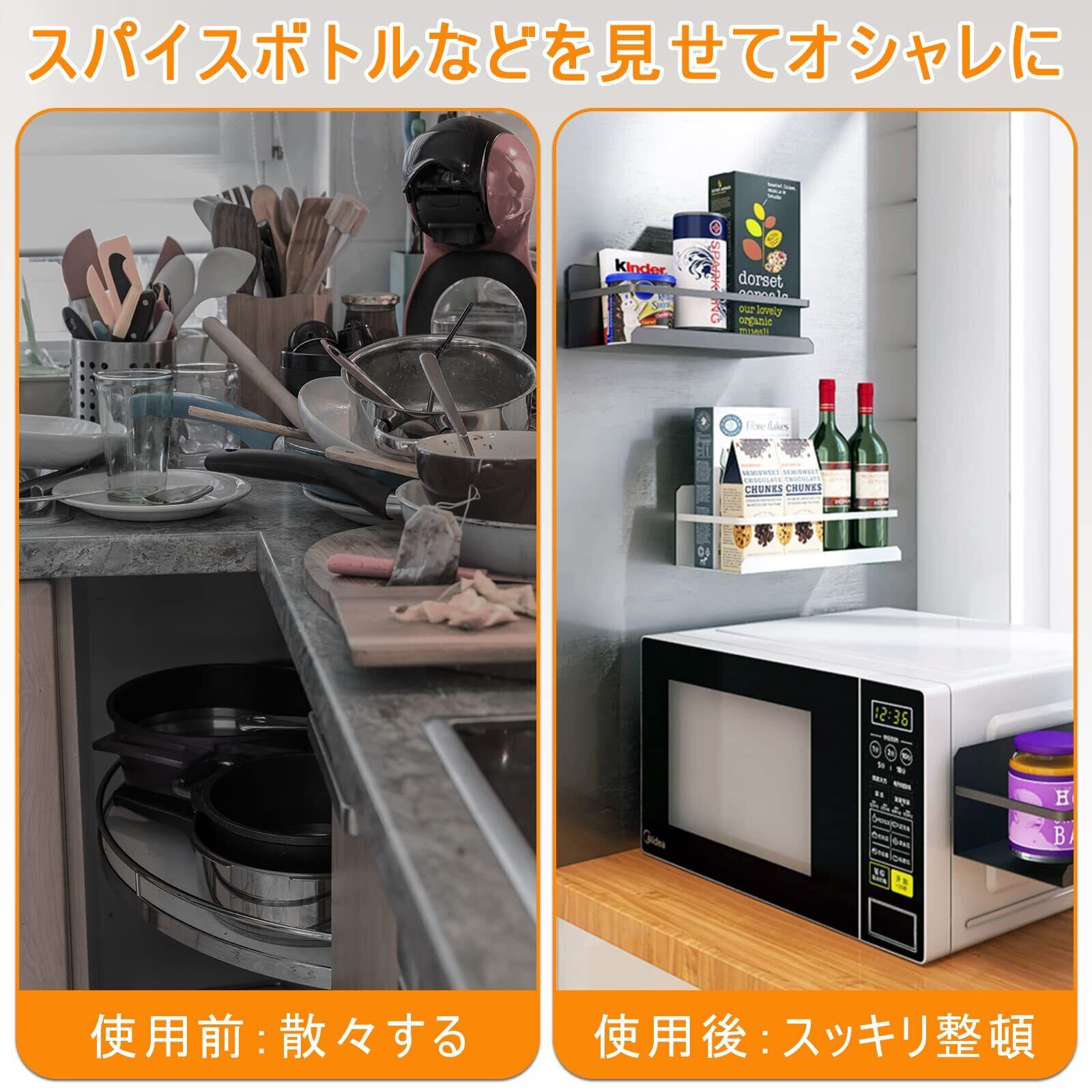 【広い奥行きデザイン】調味料ラックはシンプルなデザインとカラーで、収納品や周りの環境とよく合います。広い奥行きデザイン、キャニスターが置ける時、落ちる心配がありません。収納ラックがキッチンやバスルームや洗面所の飾りとなり、日常用品を清潔に保ちます。