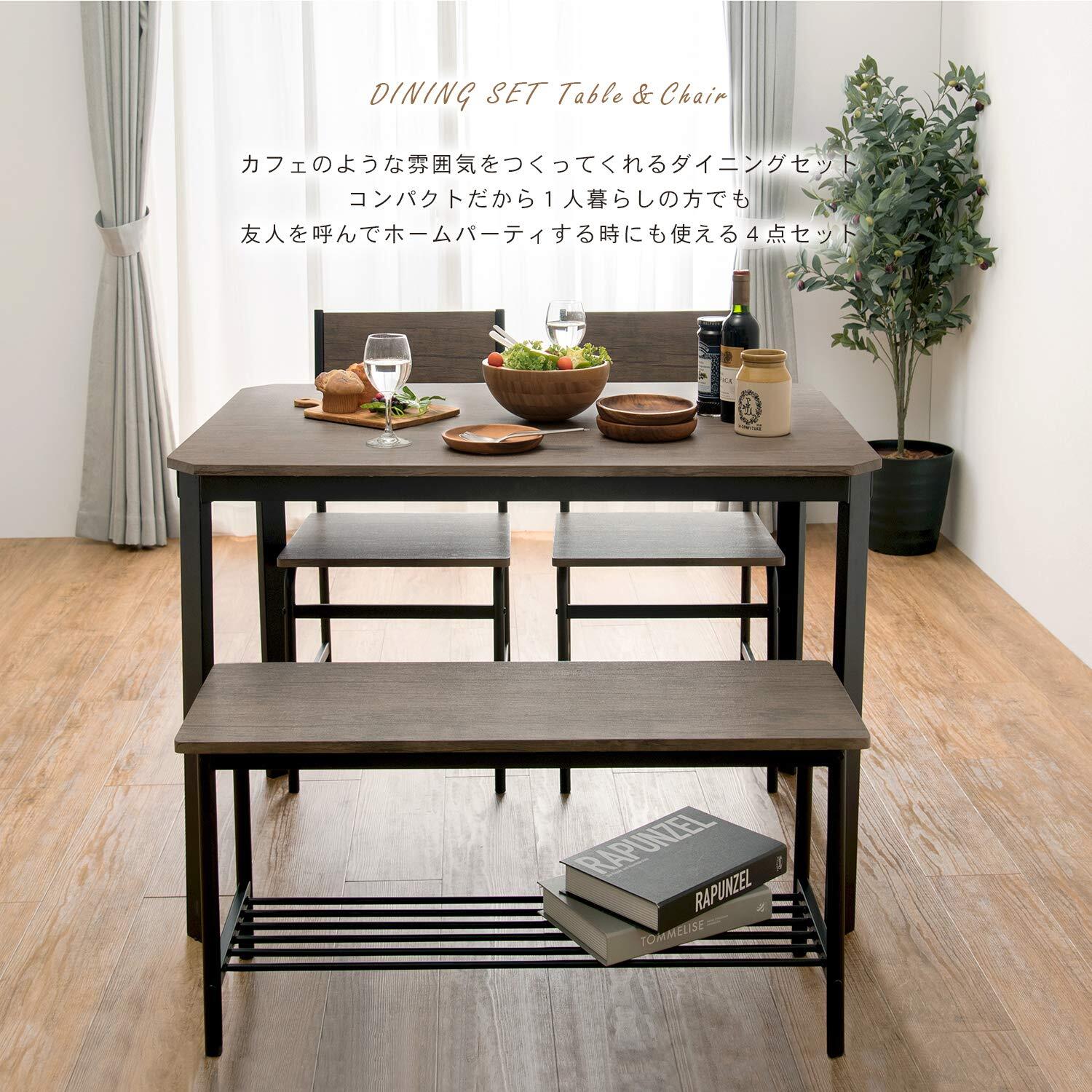 洗練されたシンプルスタイルのダイニング4点セット片側ベンチタイプ。木目調の天板に細部までこだわったスチールのフレームが洗練されたシンプルダイニングを演出。使いやすくかさばらないサイズ感の設計に体にフィットする椅子など、機能性も兼ね備えたダイニングセットです。