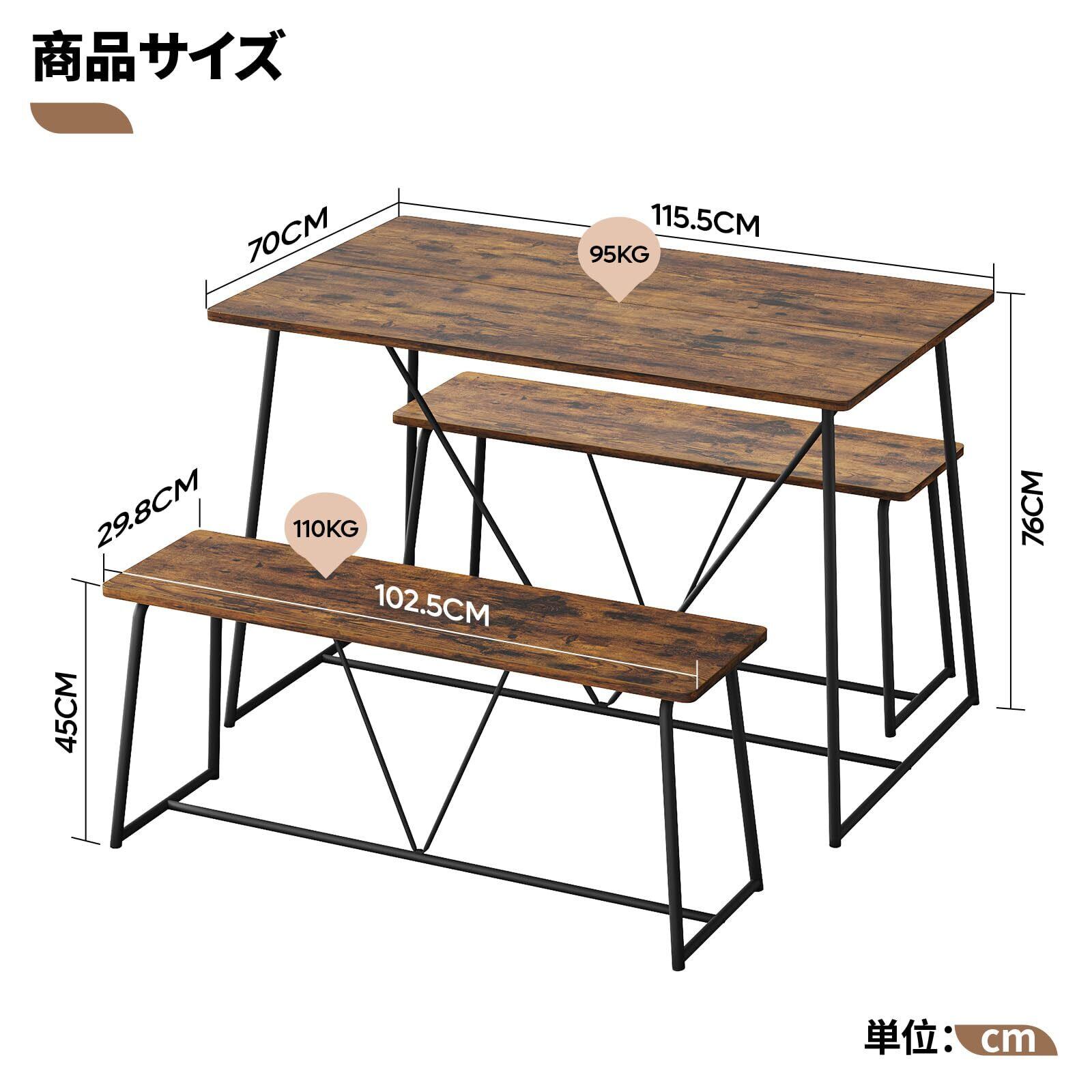 【さまざまな場面に適用】シンプルなデザインにリアルな木目と柔らかなラインが調和し、生活空間に自然に溶け込みます。ダイニングテーブルセットや作業机として多用途に活用でき、ダイニング、キッチン、リビングに最適な選択です。【商品仕様・一年付き】テーブルセット内容:テーブル×1台(約幅115.5×奥行70×高さ76cm)、ベンチ×2台(約幅102.5×奥行30×高さ45cm)■材質:パーティクルボード、スチール ■本体重量:(約)22kg