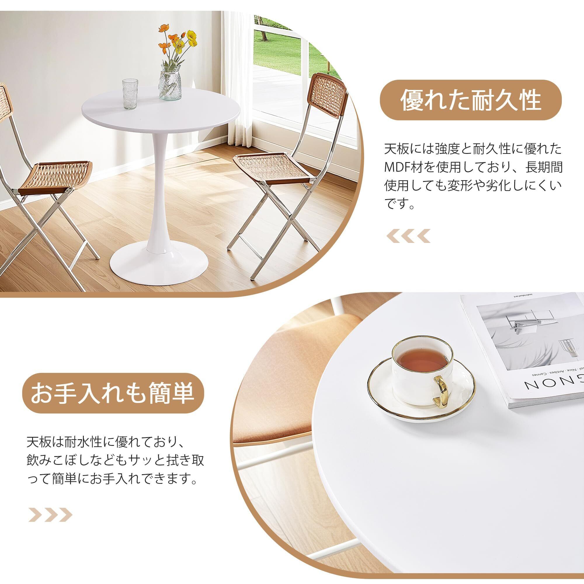 【シンプルでエレガントなデザイン】シンプルでありながらエレガントなテーブルで、美しい円形の天板は、モダンで洗練された雰囲気を醸し出し、どんなインテリアにも簡単にマッチします。清潔感のあるカラーは、空間を明るくし、他の家具や小物との調和も抜群です。オフィスやカフェ、家庭用としても使いやすく、どんなスタイルの部屋にも自然に溶け込みます。