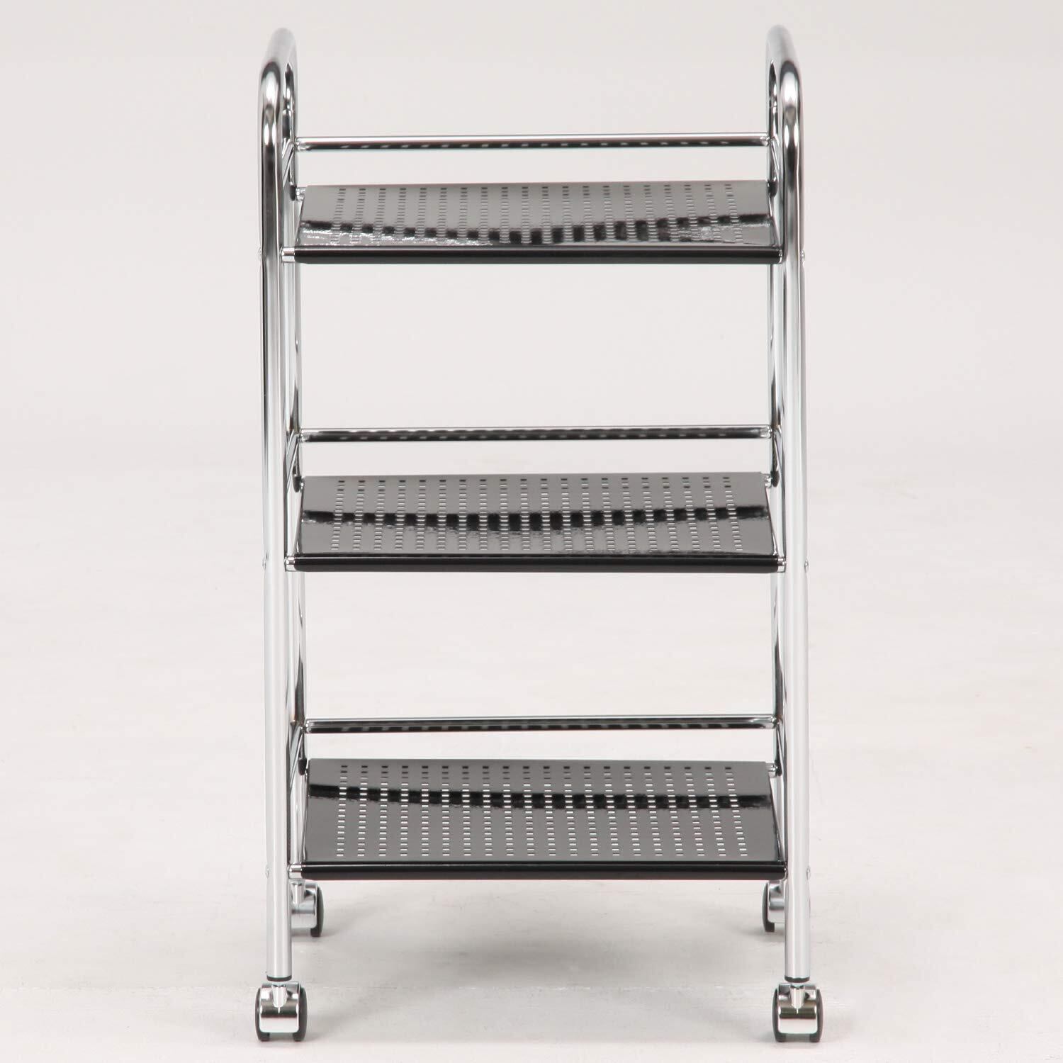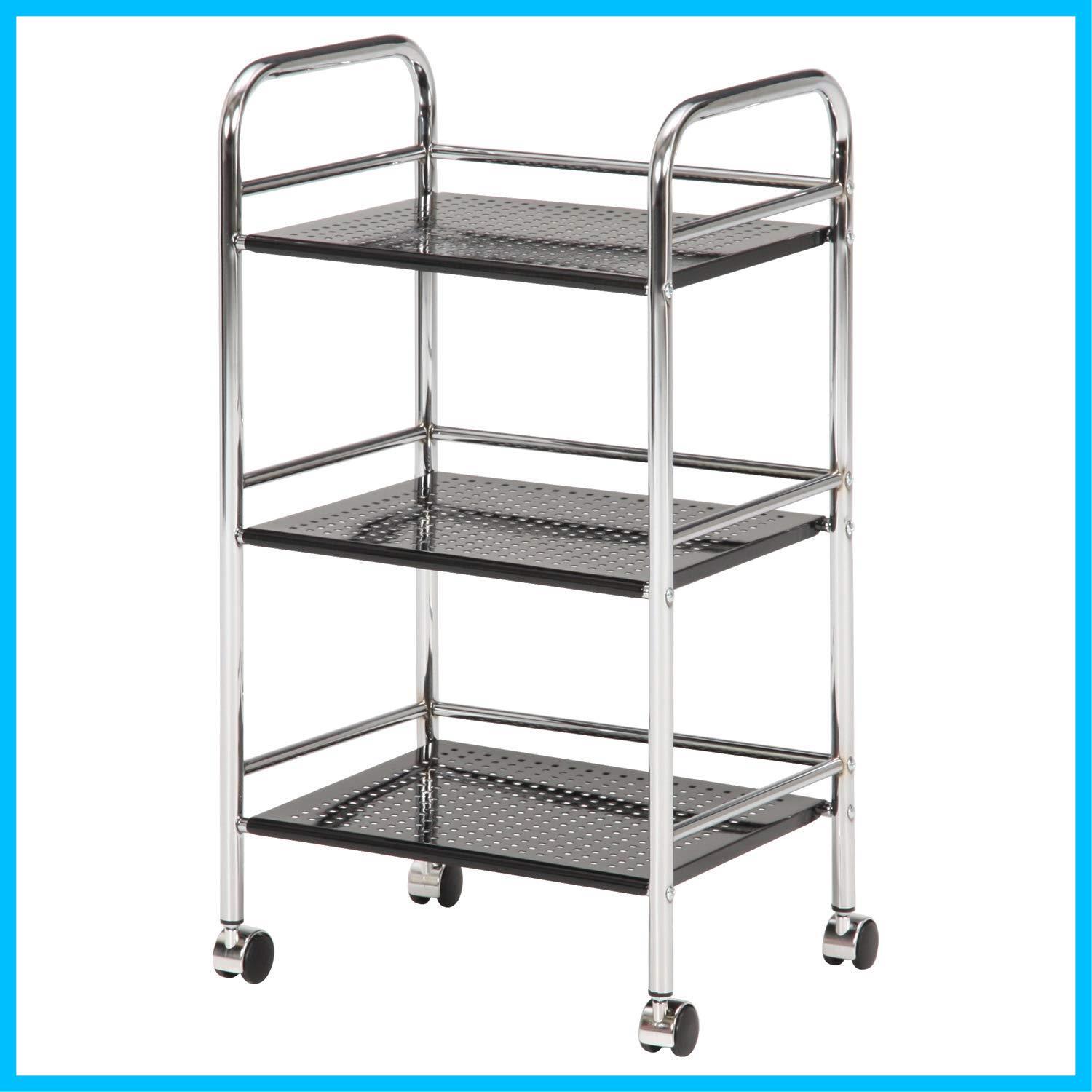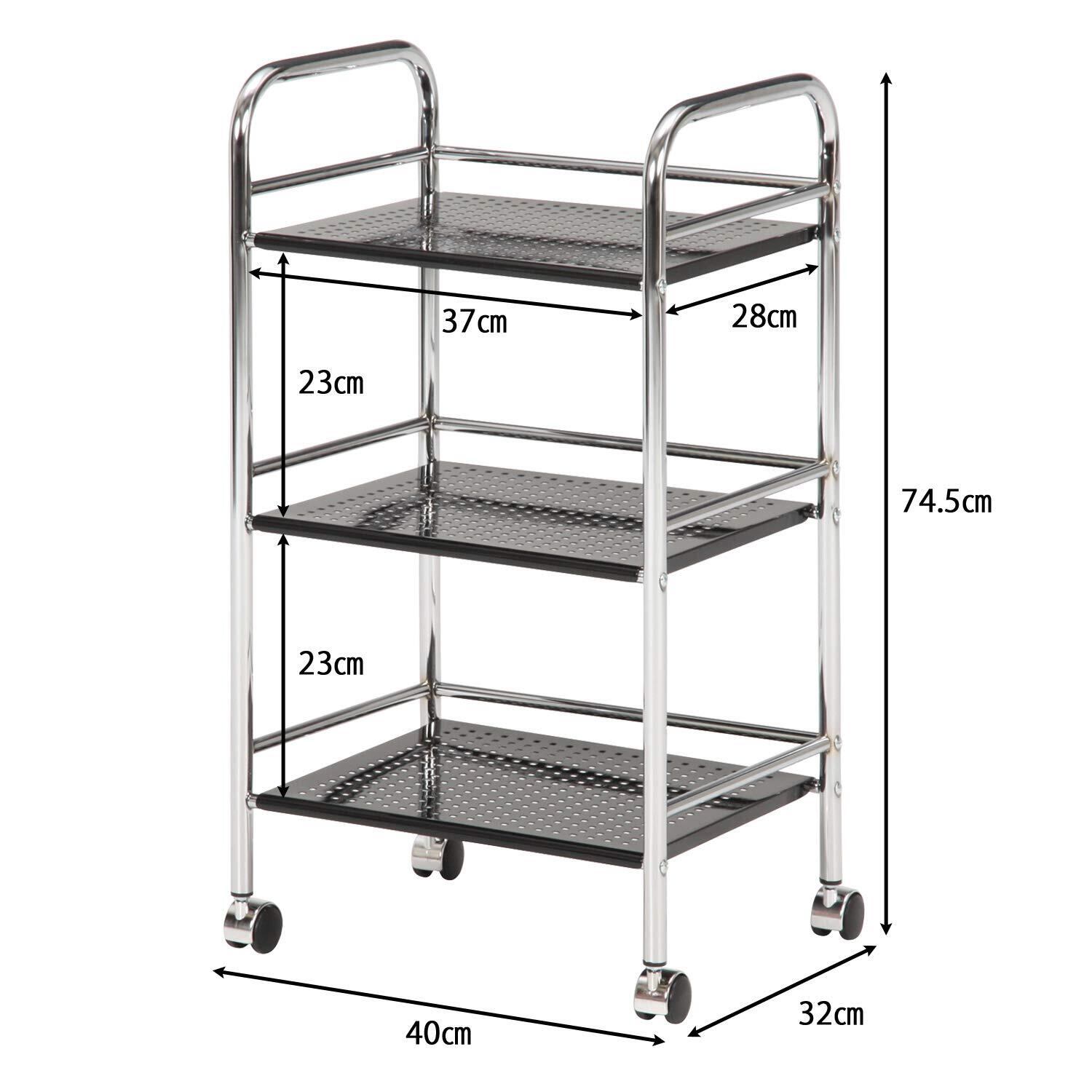 ●シンプルでマルチに使えるスタイリッシュワゴン●シルバーフレームで統一されたシンプルなデザインで、キッチン、洗面所、寝室などお好きな場所で活躍します。●幅36.5×奥行31cmの棚板が3枚あり、1枚の耐荷重が約5kg。●これ1台でたっぷり収納できます。●幅40×奥行32cmのコンパクトサイズなので、ちょっとしたスペースに収まります。●パンチング天板を使用しているので、熱もこもらず、家電製品などを置いても安心です。●棚板にはコの字型にバーが付いており、落下防止として役に立ちます。●また、ちょっとした軽いものを引っかけておくのにも便利。●キャスター付きで移動がラクラク。●掃除もしやすく衛生的です。