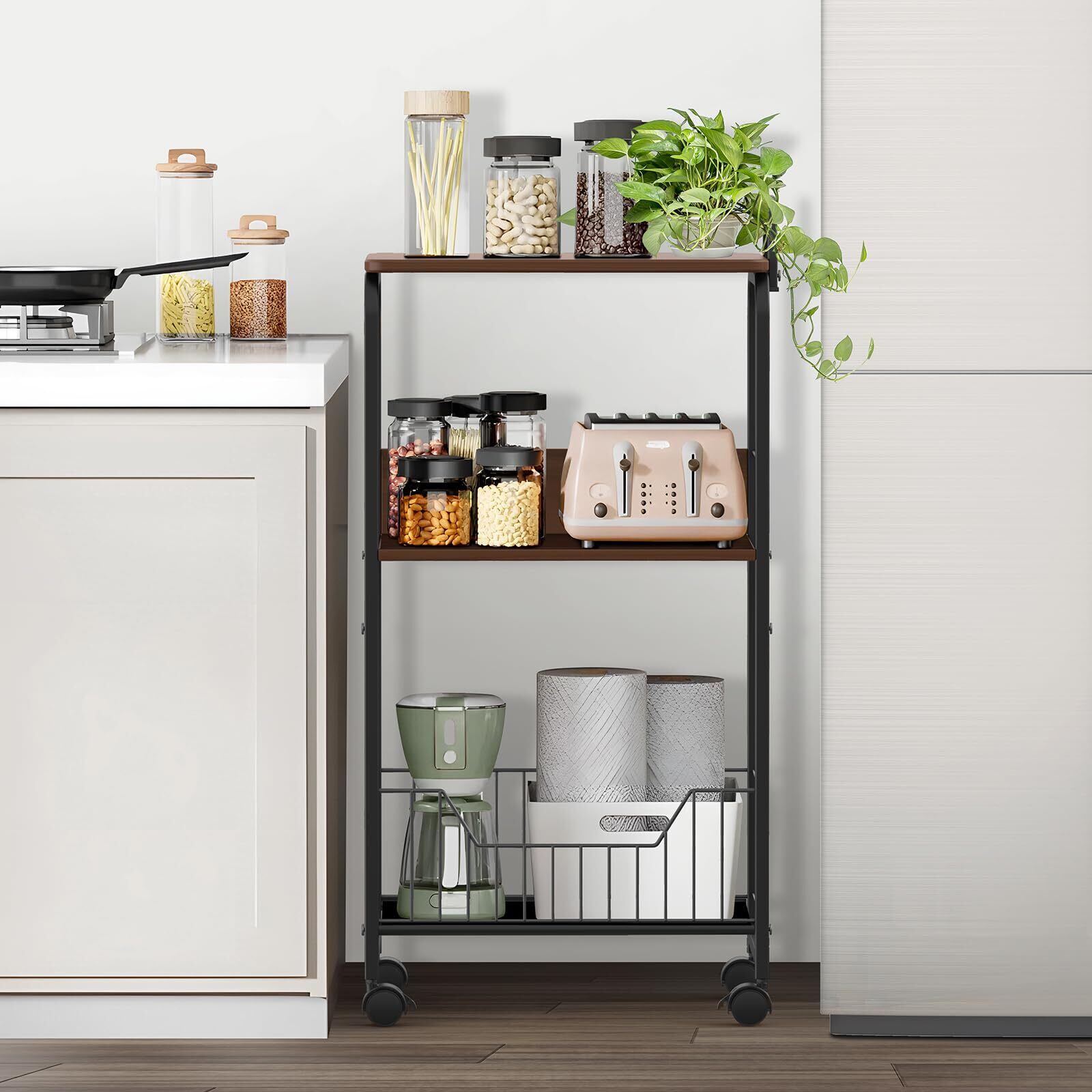 PRTONE キッチンラック キッチンワゴン キャスター付き 天板付き 幅43×奥行30×高さ87.3cm ベッドサイドテーブル メタルラック 3段 エスカン付き キッチン 収納 棚 スリム 取っ手付き ナイトテーブル ソファーテーブル スチールラック 収納ワゴン | Lulu