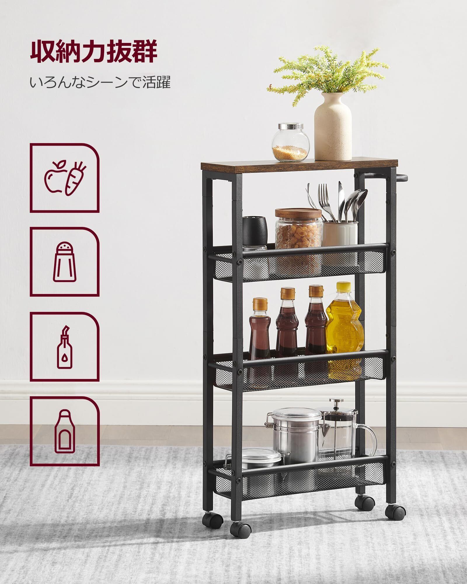 VASAGLE キッチンワゴン キャスター付き スリム 天板付き 隙間収納13CM 4段 スリムワゴンキッチンラックすき間収納 レンジ台所 洗面所 冷蔵庫横 高さ77CMLRC032B01 (ブラウン) | Lulu