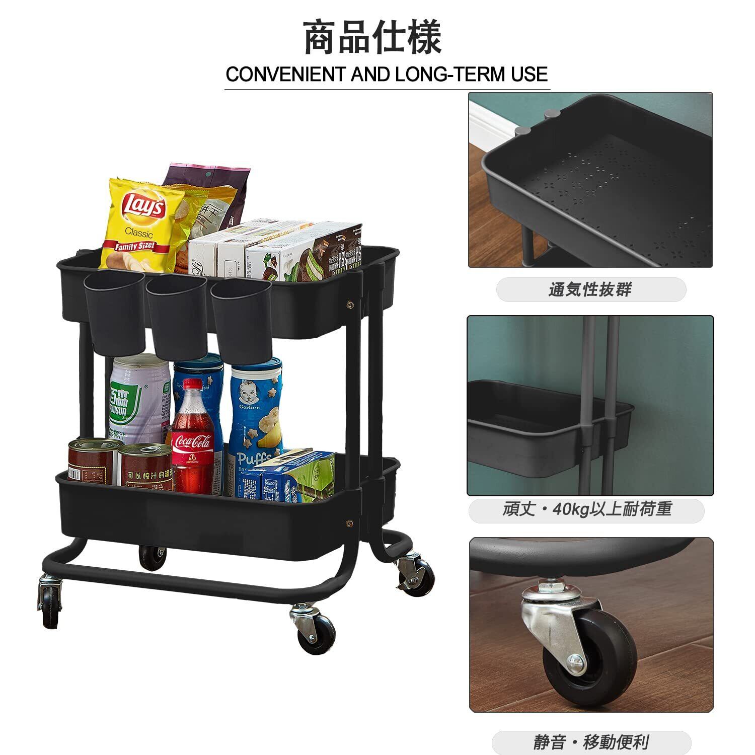 【大容量、強い耐荷重】:幅42×奥行35×高さ47cm 全体耐荷重:20kg。パッケージ内容:本体+キャスター×4+コップ式フック×3。カゴの縁に掛けるコップ式フック付属、キッチンツールやお箸などにも置けるし、洗面所で歯磨きやブラシなども置けるし、ほかのご使用方法もご検討ください。