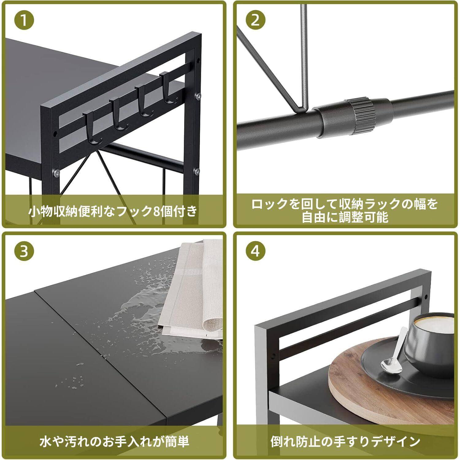【棚板高さ調節】高さを自由に調整できる棚板で、様々なサイズの調理器具に対応。 棚板の高さはお好みに合わせて簡単に調整可能。トースターや電子レンジ、その他の調理器具に応じて配置を変更できるため、使い勝手バツグンです。