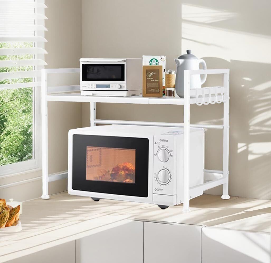 レンジ上ラックトースターラック 伸縮式 幅(40-60cm)キッチン電子レンジ台 棚板高さ3段調節 耐荷重50kg フック5つ付き 組み立て簡単 お洒落 収納ラックホワイト