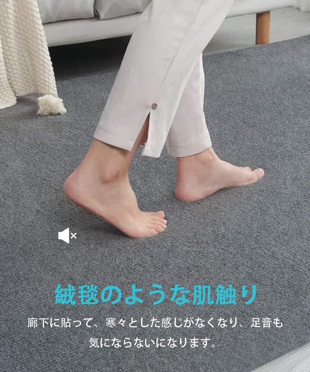 「騒音対策、キズ防止」吸音性が高い、このカーペットは様々なところに適しています。ゲームをする時チェアの摩擦音、子供が走って遊ぶ音、ペットの爪がフローリングに当たる音など、小さな生活音を吸音し、和らげることができます。廊下に貼りました。寒々とした感じがなくなり足音も気にならないぐらいになりました。
