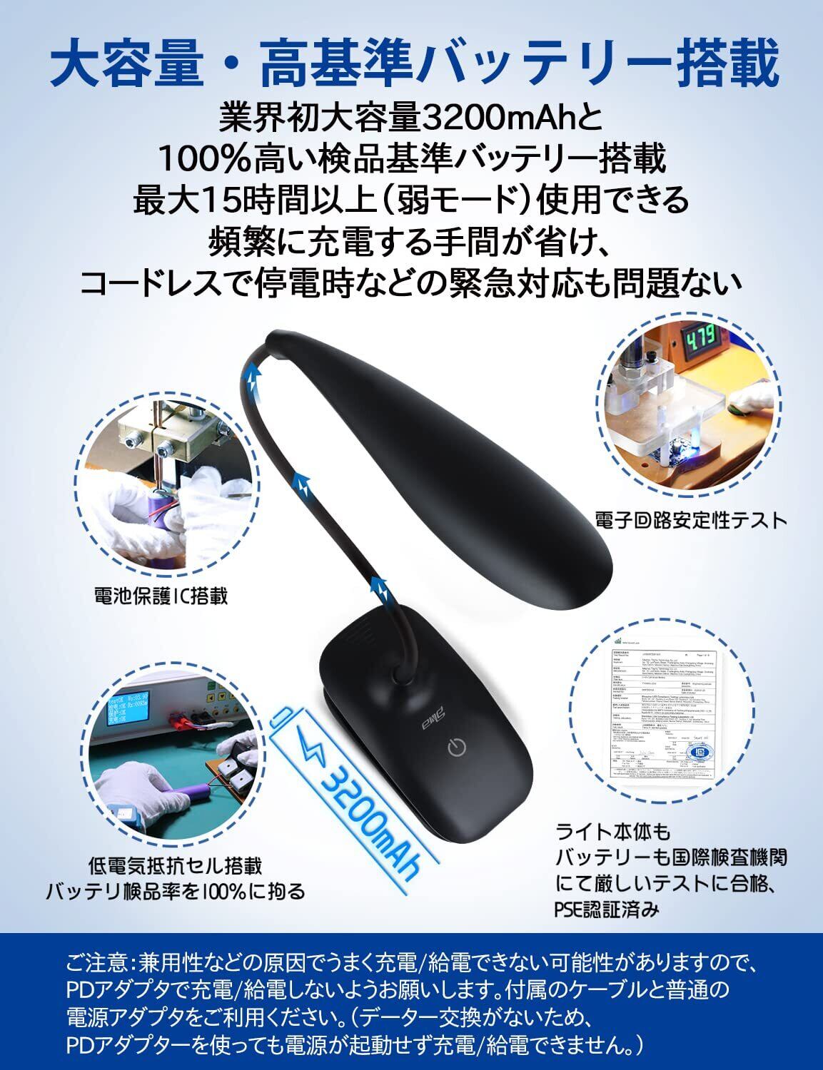 ENERG クリップライト コードレス LEDブックライト 目に優しい デスクスタンド PSE認証済み大容量3200mAh 2025年モデル 360度回転 タッチ式三段階調光 USB充電 電気スタンド Web会議面接 防災グッズ PC作業・仕事・寝室・卓上・ドレッサー・読書・哺乳・譜面・災害時ライト LEDユニット20個 昼暖色 T12-EN139 ブラック
