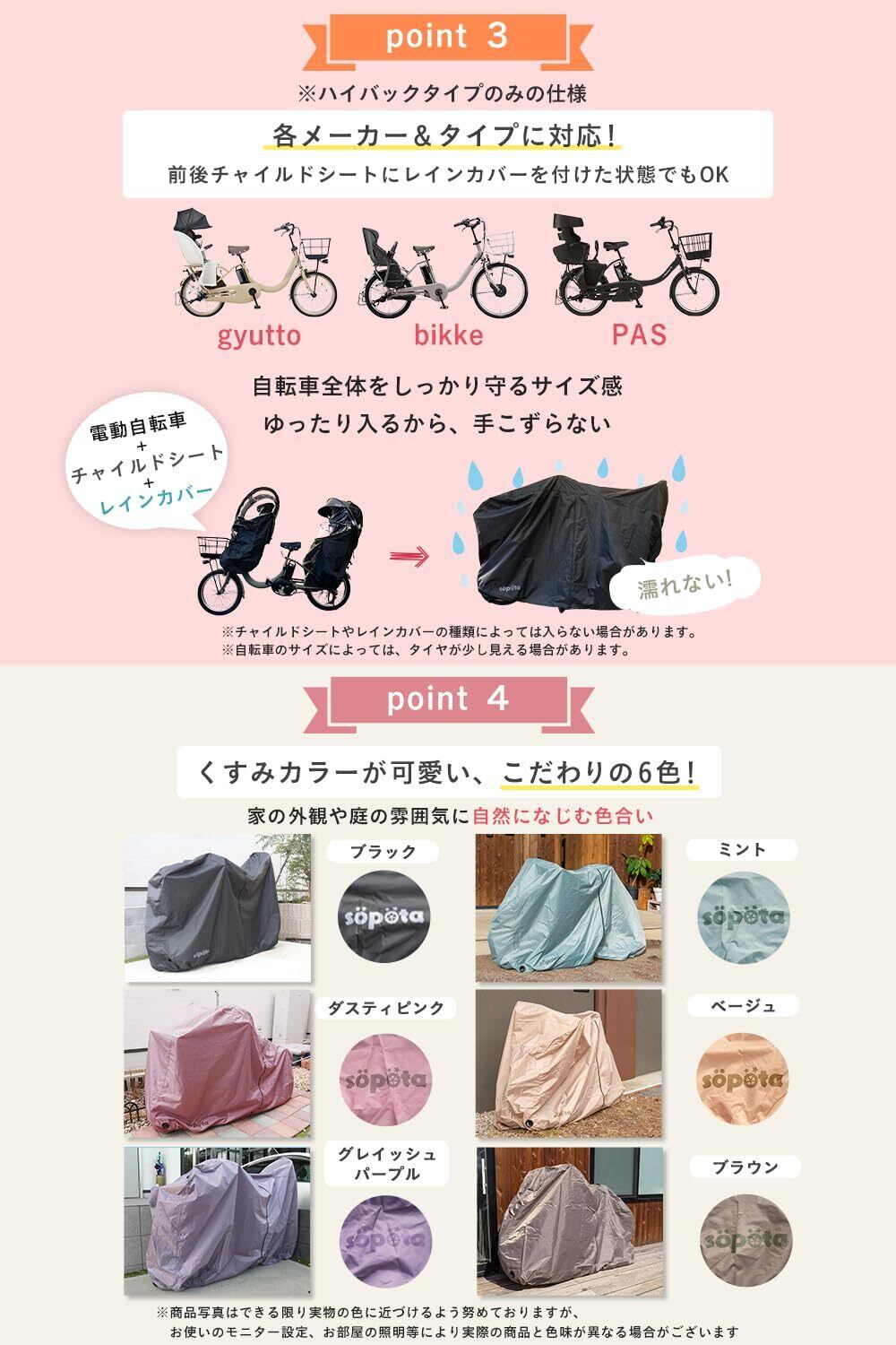 【おしゃれで安心の自転車カバー!】söpötaの自転車カバーは、洗練されたくすみカラーを6色展開しており、おしゃれなスタイルと機能性を両立。子供乗せ対応のデザインで、安心してお子様を乗せて出かけられます!