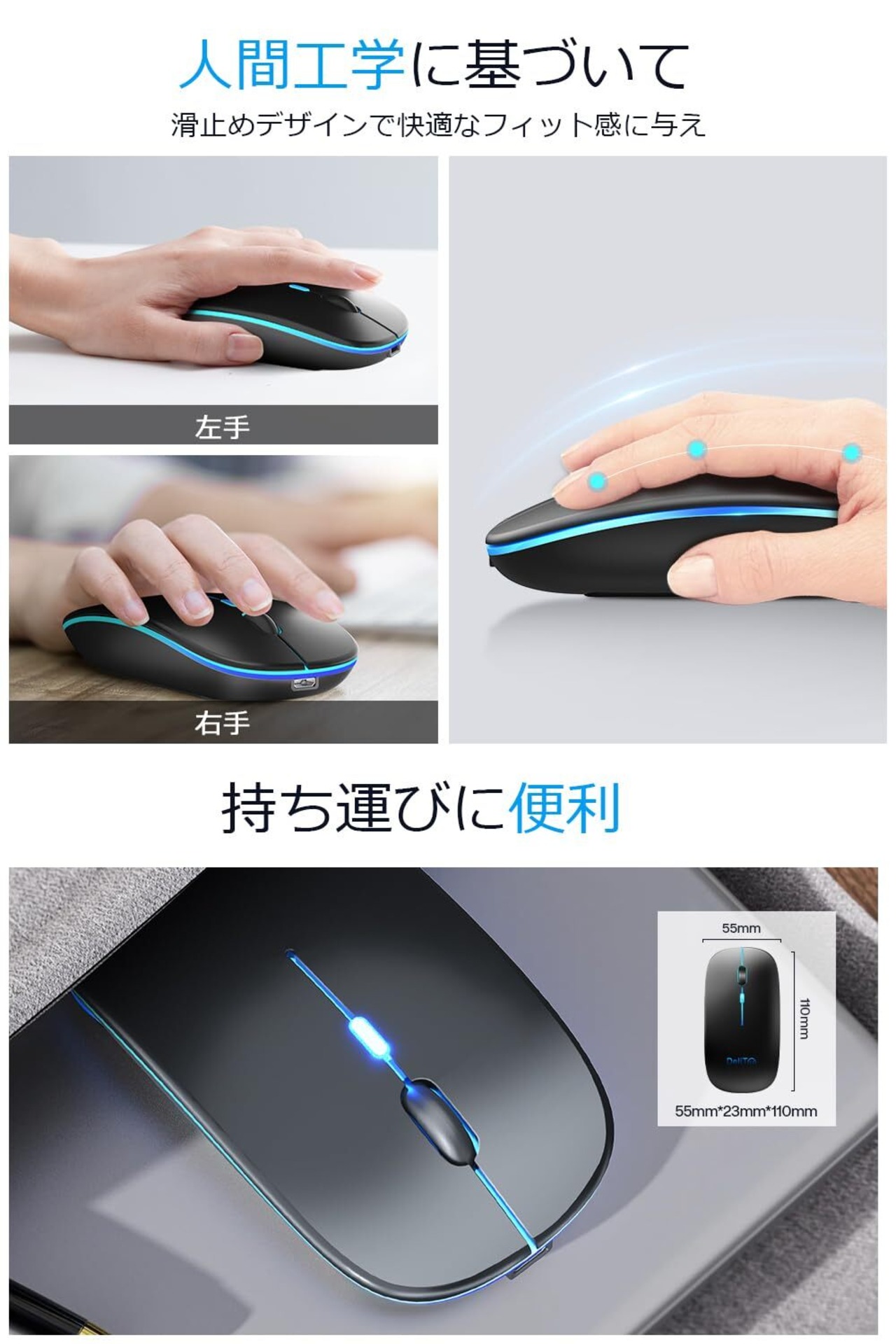 マウス 無線 静音 【薄型&高精度・高感度】 ワイヤレスマウス 3段階DPI切替 7色ライト付き 2.4GHz 節電モデル 小型 光学式 高精度 左右対称 無線 充電式 軽量 握りやすい 簡単接続 携帯便利 パソコン Windows Mac PC対応 (ブラック)