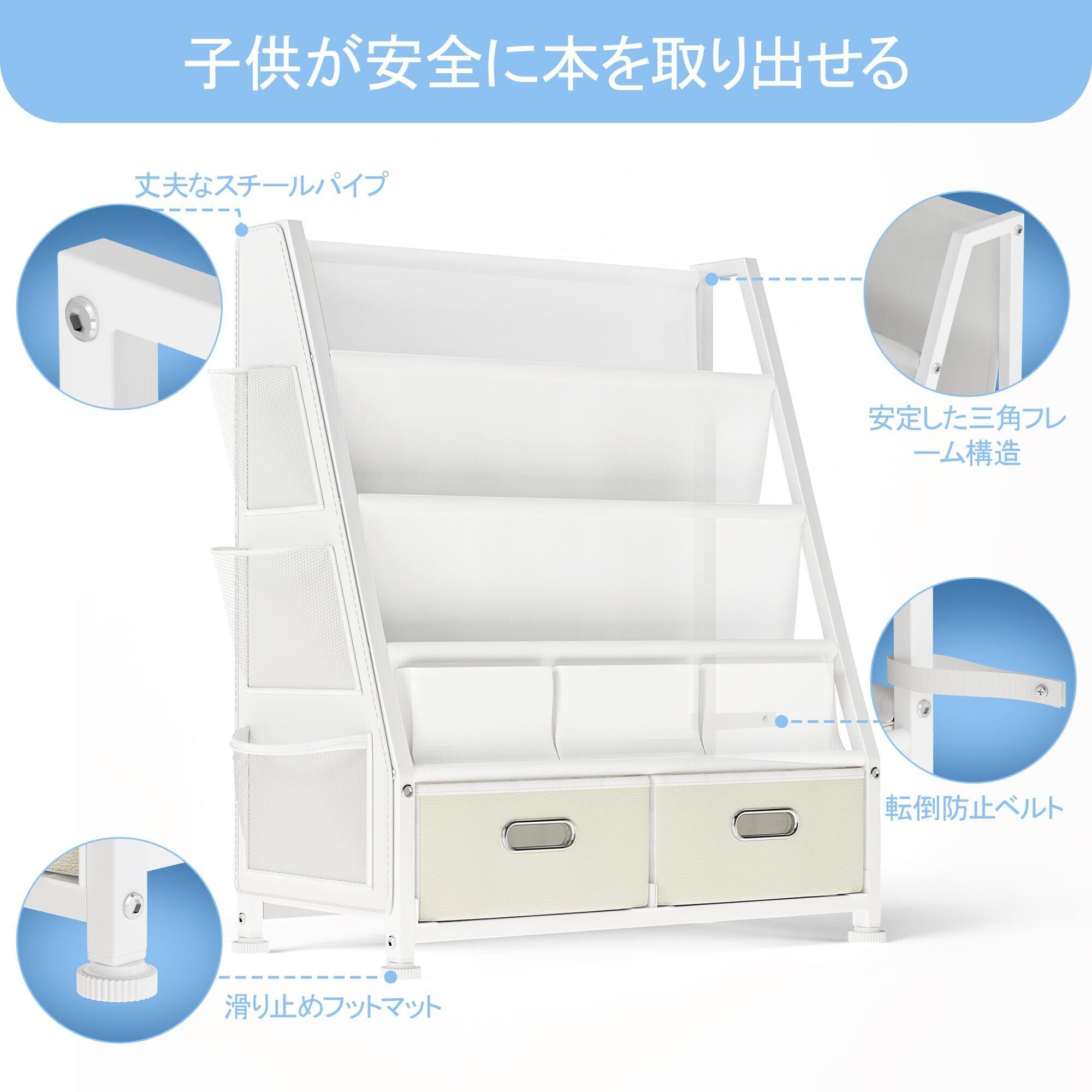 【安心の安全設計】本棚は安定した構造になっており、ひっくり返る心配が少なく、安全にご利用いただけます。また、角が丸く設計されているため、小さなお子様がいる家庭でも安心です。
