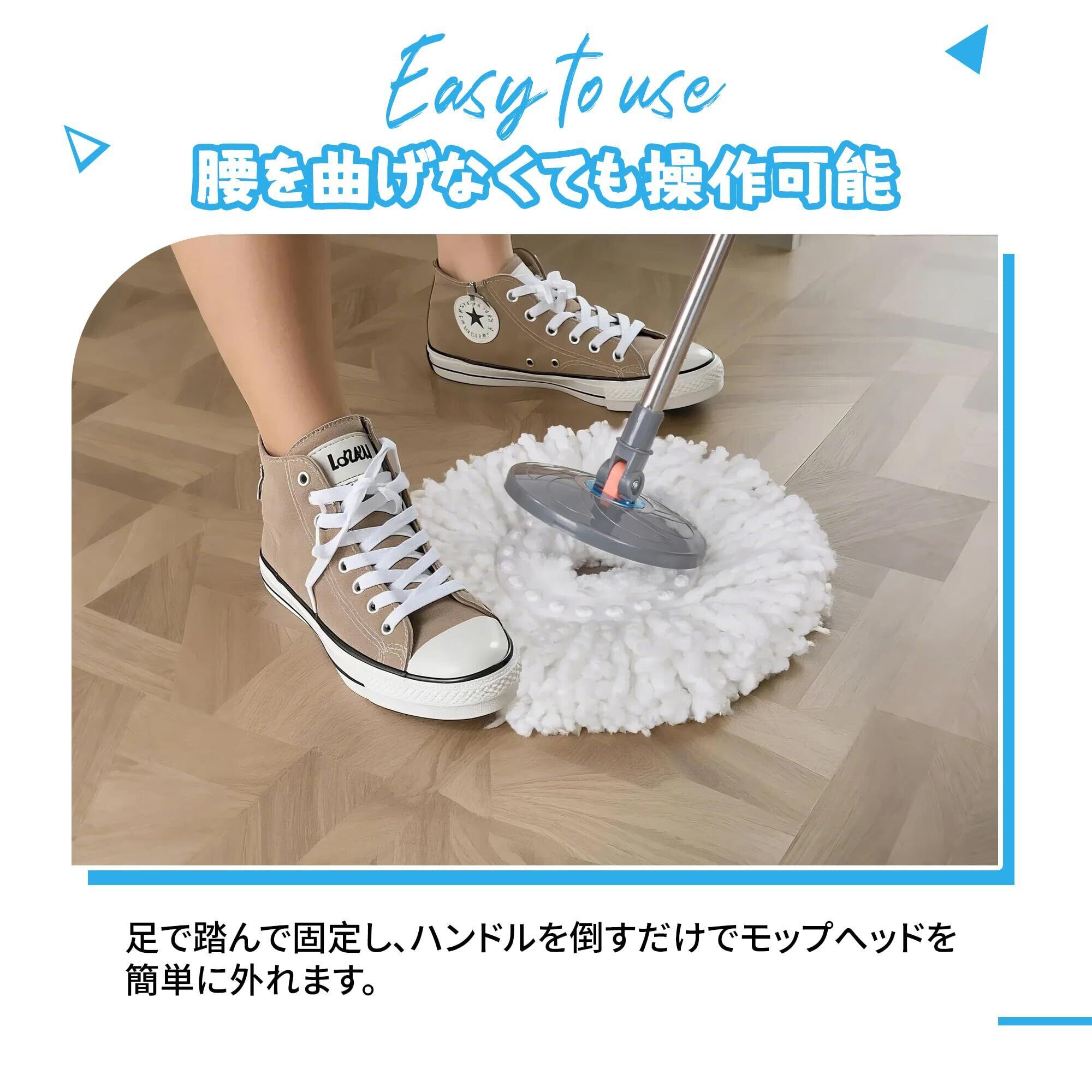 【長さ調整可能&360度回転モップヘッド】ハンドルは伸縮式であり、身長や使用環境に応じて柄の長さを調整できます。これにより、自分に合った高さで、無理なく掃除作業ができます。また、モップヘッドは360度回転可能で、狭い隙間や家具の下など、通常のモップでは届きにくい隅々までも簡単に掃除でしっかり清掃できます。