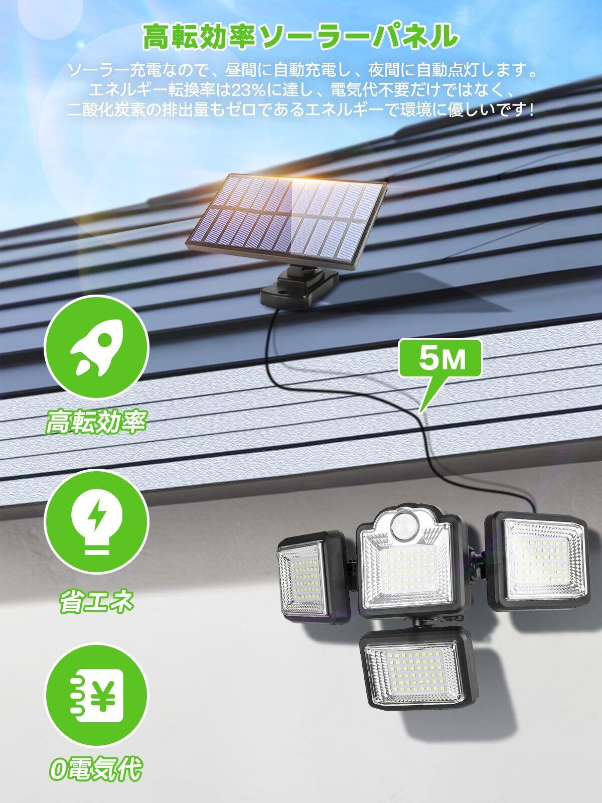 【改良型4灯分離式/一体式】改良設計のソーラーライトは、2種類のデザインから任意に選択できます。分離式ソーラーライト:ソーラーパネルはランプボディから分離され、付属の防水ケーブルでライトとパネルを5.5mまで離して取り付けることができます。ソーラーパネルは日当たりの良い場所に設置でき、ライトは屋内/屋外/駐車場など様々な場所に取り付けることができます。一体式ソーラーライト:ソーラーパネルがソーラーライトに吊り下げられ、ソーラーライト一体型になります。 どちらのスタイルのソーラーライトも単結晶ソーラーパネルを使用しており、従来のソーラーライトに比べて変換率が23%に向上しています。