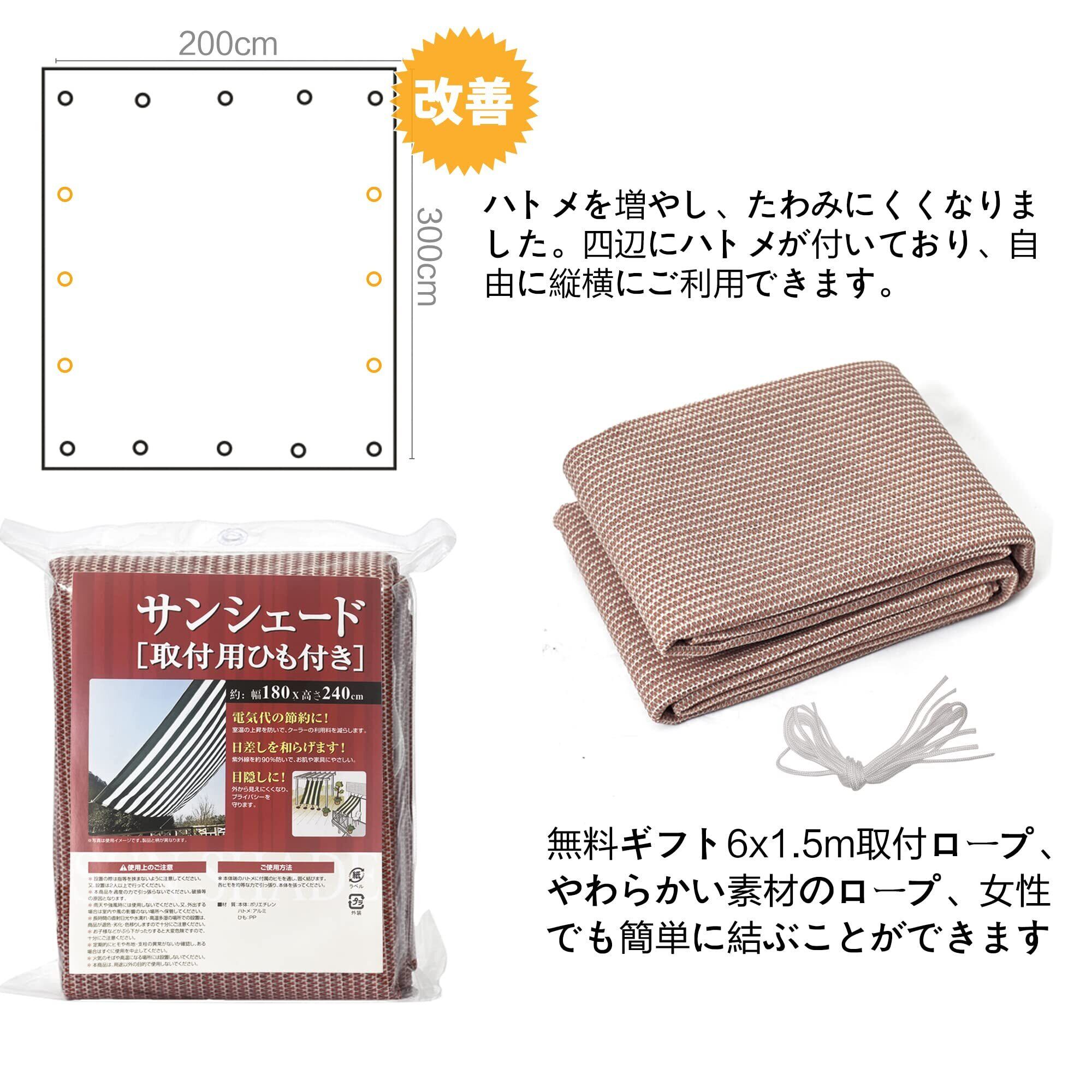 取り付け:錆びないのゴールデンアルミハトメが付いているので、付属品6x1.5m取付けひも、ベランダや窓ペ、廊下、庭下、庭先、玄関などに簡単に取り付けることができます。お洒落なデザインなので、日よけだけでなく、ご自宅やお庭のエクステリアとしてもご利用なれます。