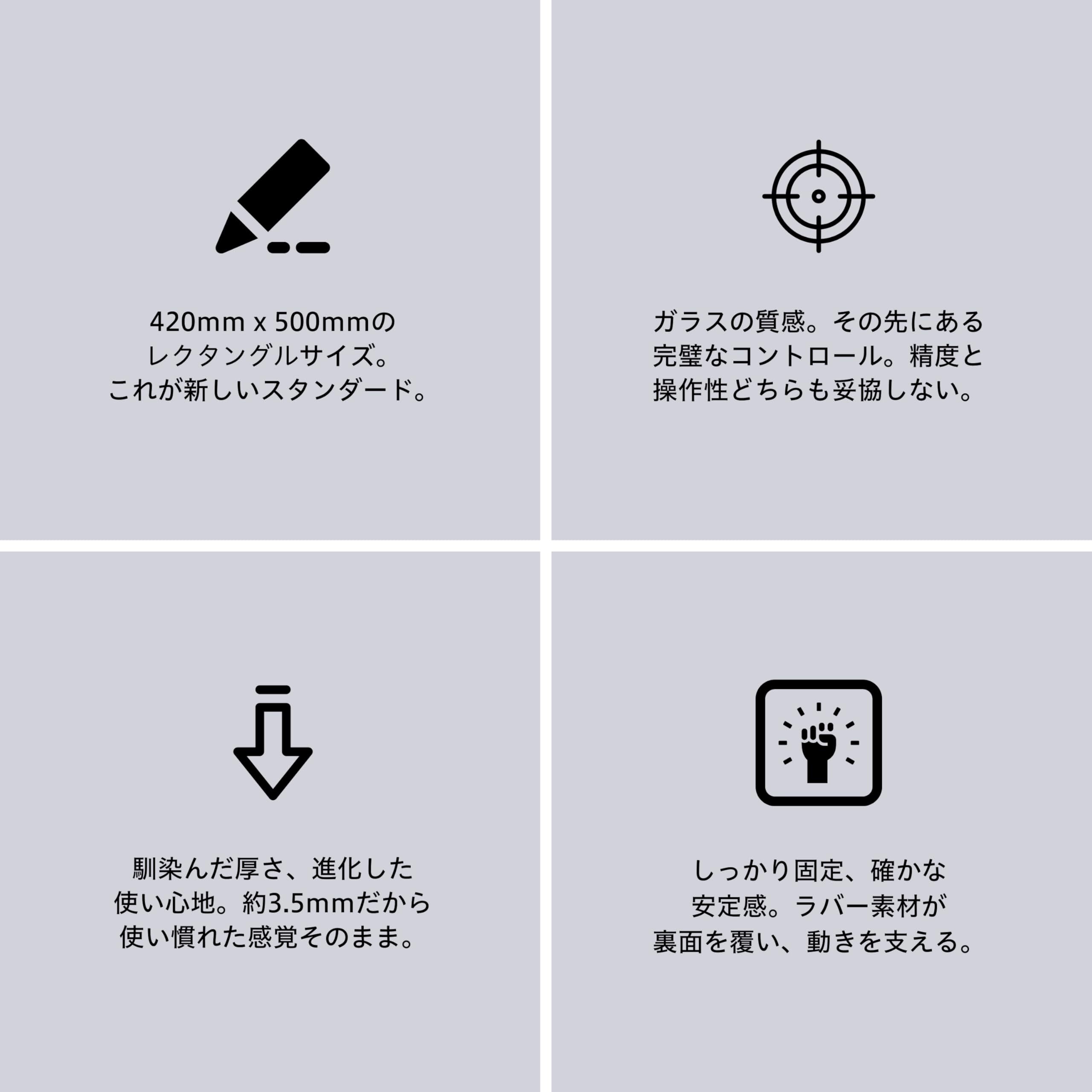 完成されたコントロール。行き過ぎない、足りないもない。この絶妙なコントロール感覚がどんな動きも思い通りに反映します。ガラス製のマウスパッド「叢雲」がもたらすのは、常に変わらない最高の操作感。ゲームにも作業にも最高の相棒を。