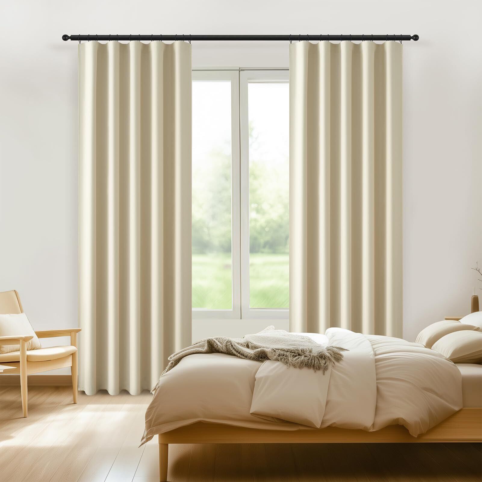 【サイズ】遮光カーテン(2枚組)の幅は、1.5倍ひだの波状効果で約100cm、全展開時で143cmとなります。