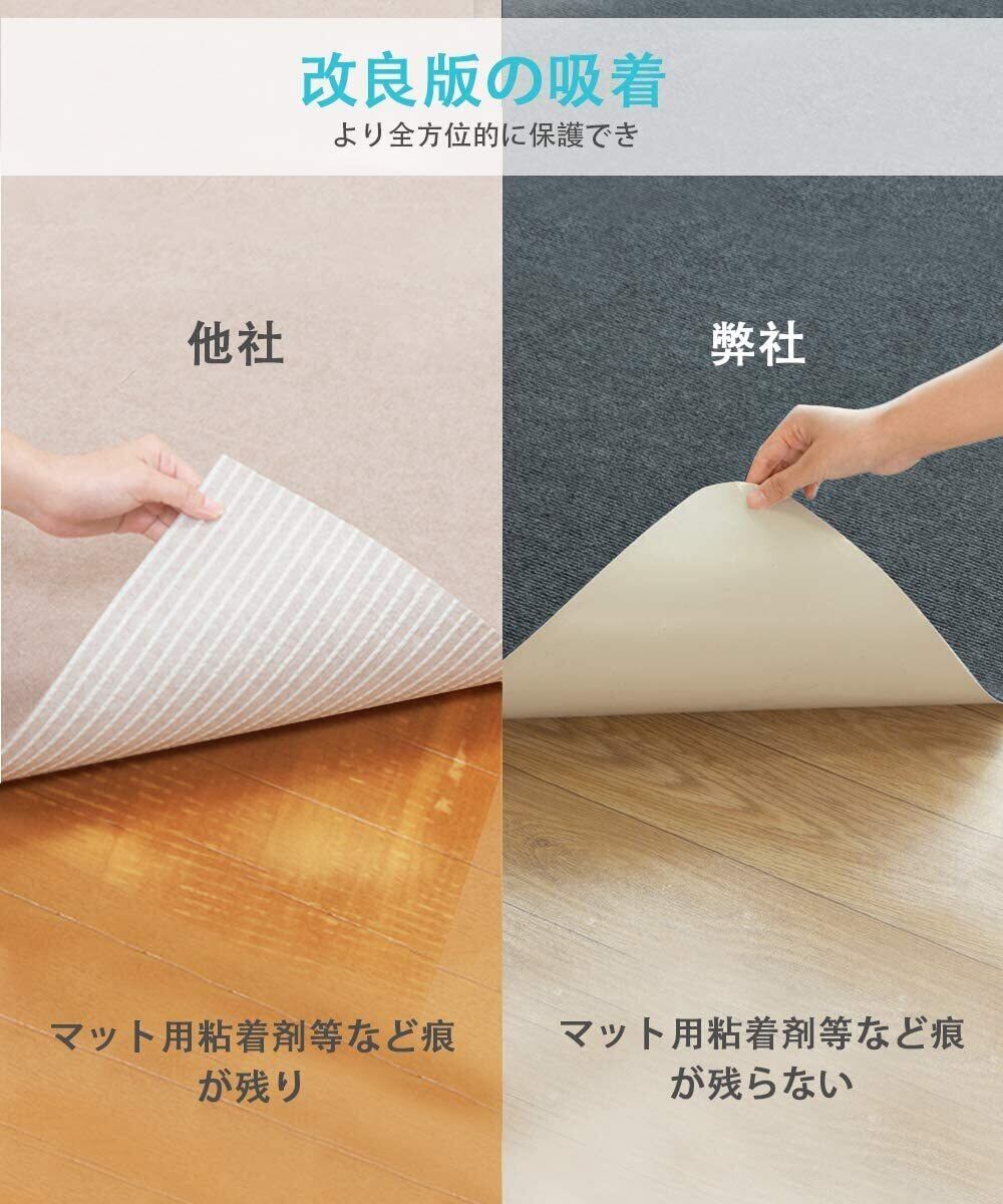 「使用重複」裏はずれない吸着加工、無数の吸盤ができたようにくっつく仕組みでシールを剥がして貼るだけピタックと床に密着。色はダックグレーだから汚れにくくて掃除も大変便利です。そのまま掃除機をかけても大丈夫です。清掃もラクラク。長期使用後、手または洗濯機で洗濯できます。装着後、剥がしても跡が床に残りません。重複使用しても吸着力が弱くなりません。何回も繰り返してご使用いただけますので、環境にも財布にも優しい。