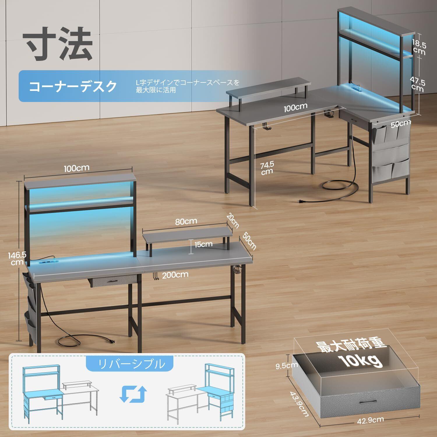 - 特徴:LEDライト付き、コンセント付き、引き出し、収納ラック、モニタースタンド、収納バッグ