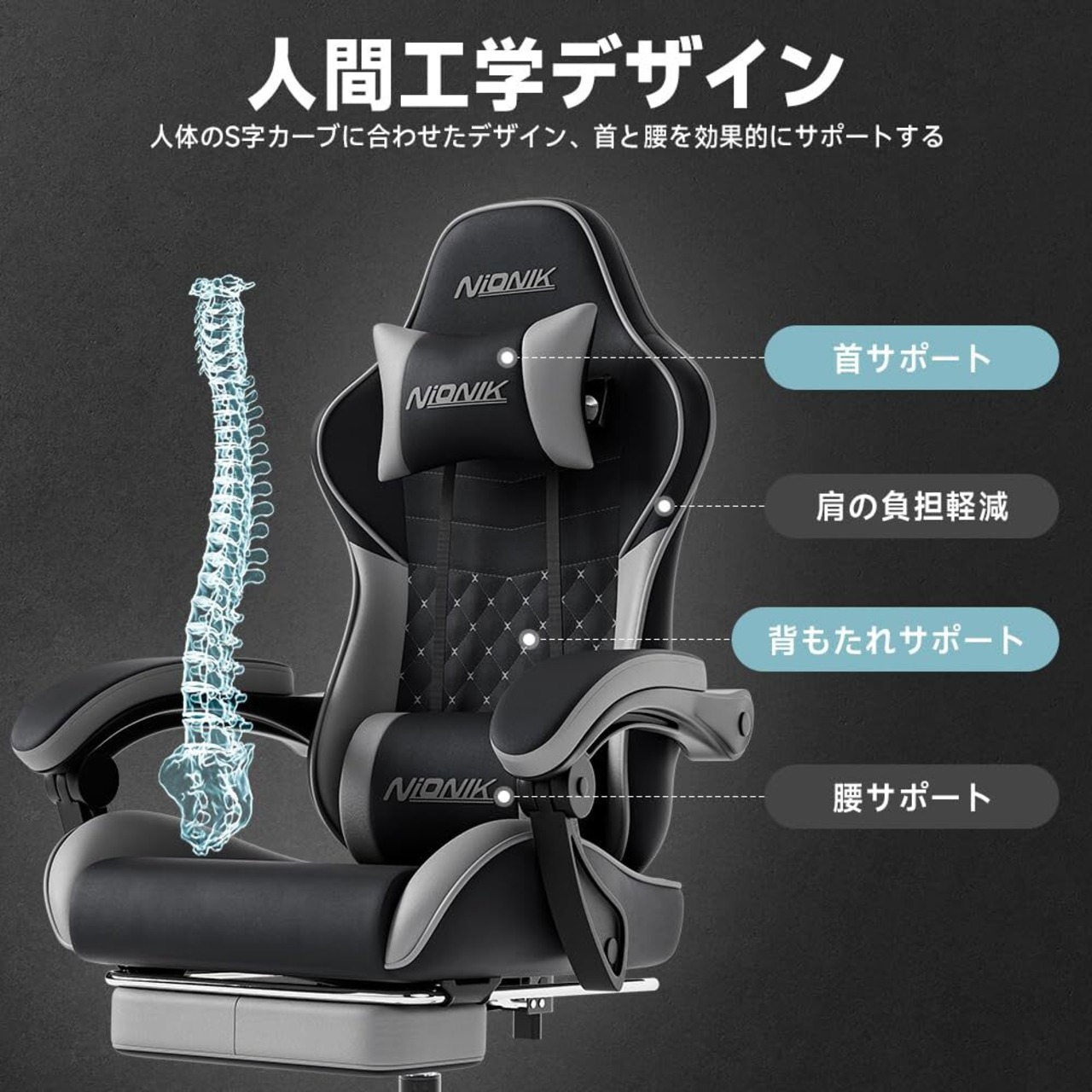 【人間工学設計で快適な座り心地!】NIONIKのゲーミングチェアは、座面が幅広で安定感抜群。長時間の作業やゲームプレイでも体への負担を軽減し、快適さを追求しています。腰痛対策にも配慮した設計で、あなたの健康をサポートします!