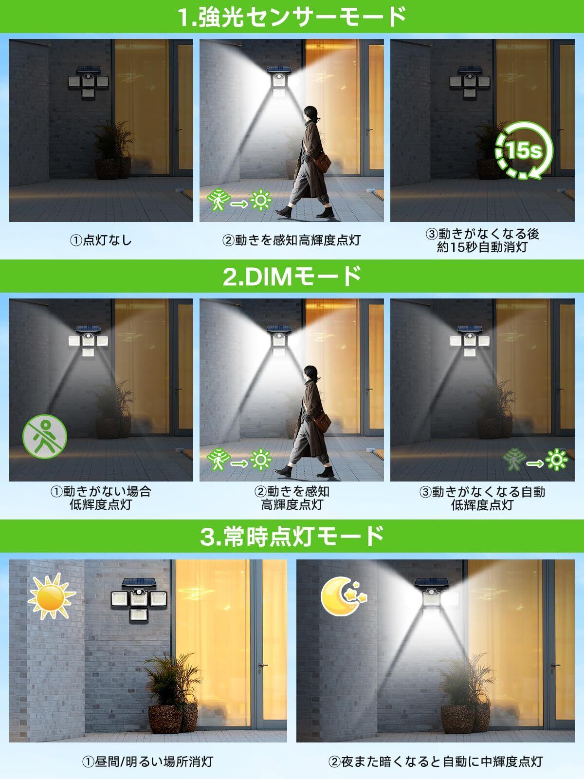 【リモコン操作可能/3つの点灯モード切替】この人感センサーライトはリモコン付き、リモコンのボタンを押すだけで3つのモードを設定できます。 センサーモード:人が検知されると、自動に高輝度点灯になって、動きがなくなると約15-20秒後消灯になります。常時点灯モード:夜または暗くなると自動的に中輝度点灯します。DIMモード:夜間または暗くなると自動的に低輝度が開き、人/車を感知すると高輝度になり、人/車が離れてから約20秒で低輝度が開く。