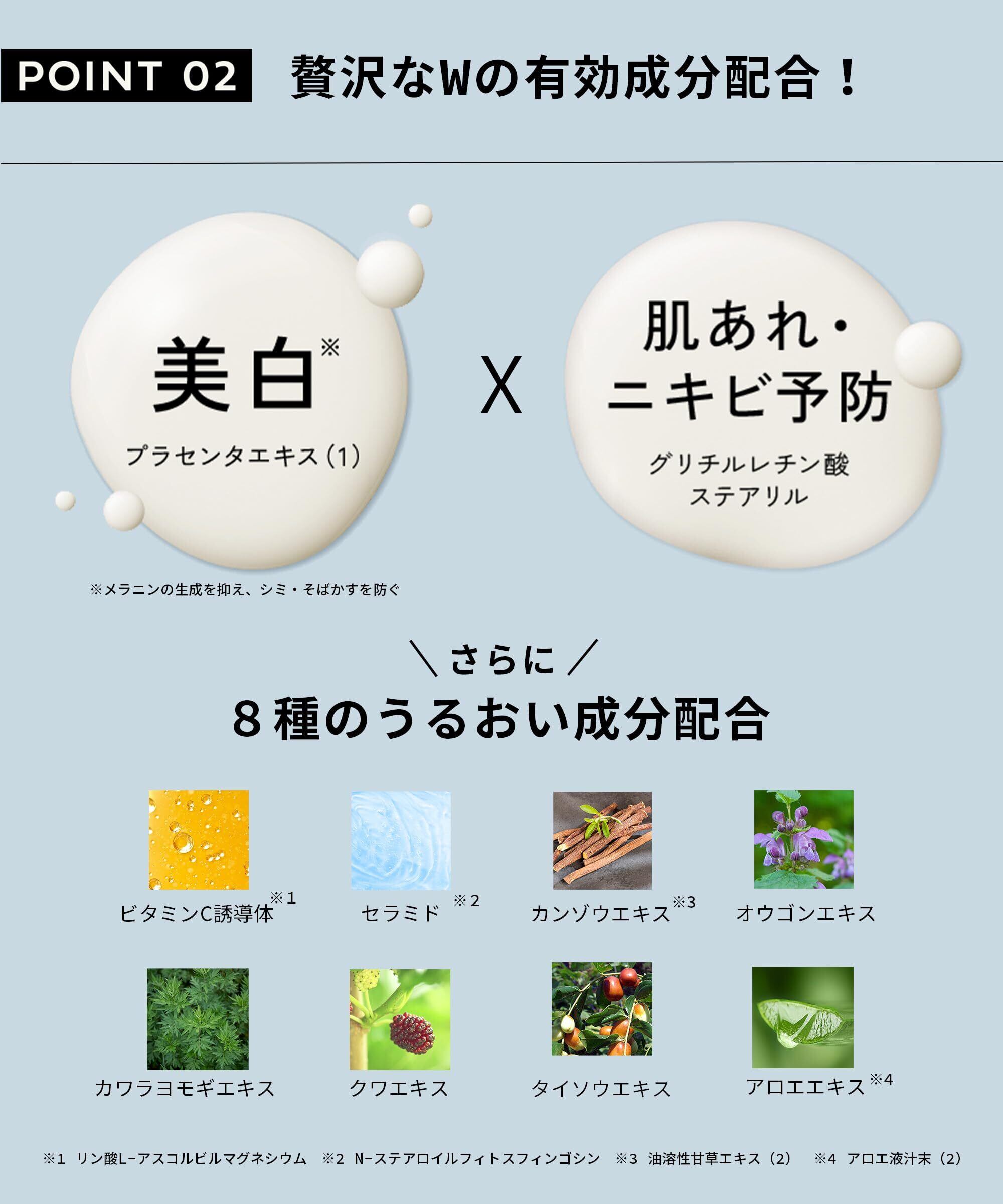 【医薬部外品・2種の有効成分配合】プラセンタエキス(1)が美白※1を、グリチルレチン酸ステアリルが肌あれ・ニキビを予防。肌トラブルに悩む方にもうれしい処方です。