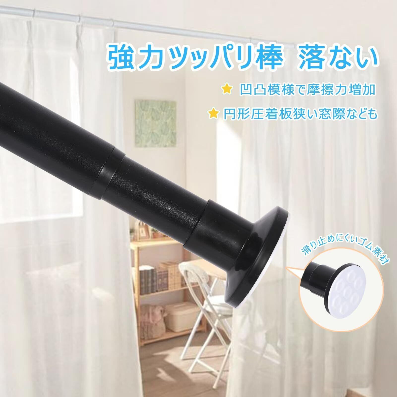 【落ないつっぱり棒】 强力ばねを内蔵して、長く伸ばしてもずれ落ちる心配がないです。両端の圧着板は凹凸があり、壁との摩擦力が強くて、重い物を掛けても落ちません。また、壁と接触する部分は滑り止めゴムを採用して、更に壁摩擦力を增え、しっかり固定できます。※斜面や湾曲面、凸凹のある壁面には設置できないことをご注意ください。必ず水平に取り付けてください。
