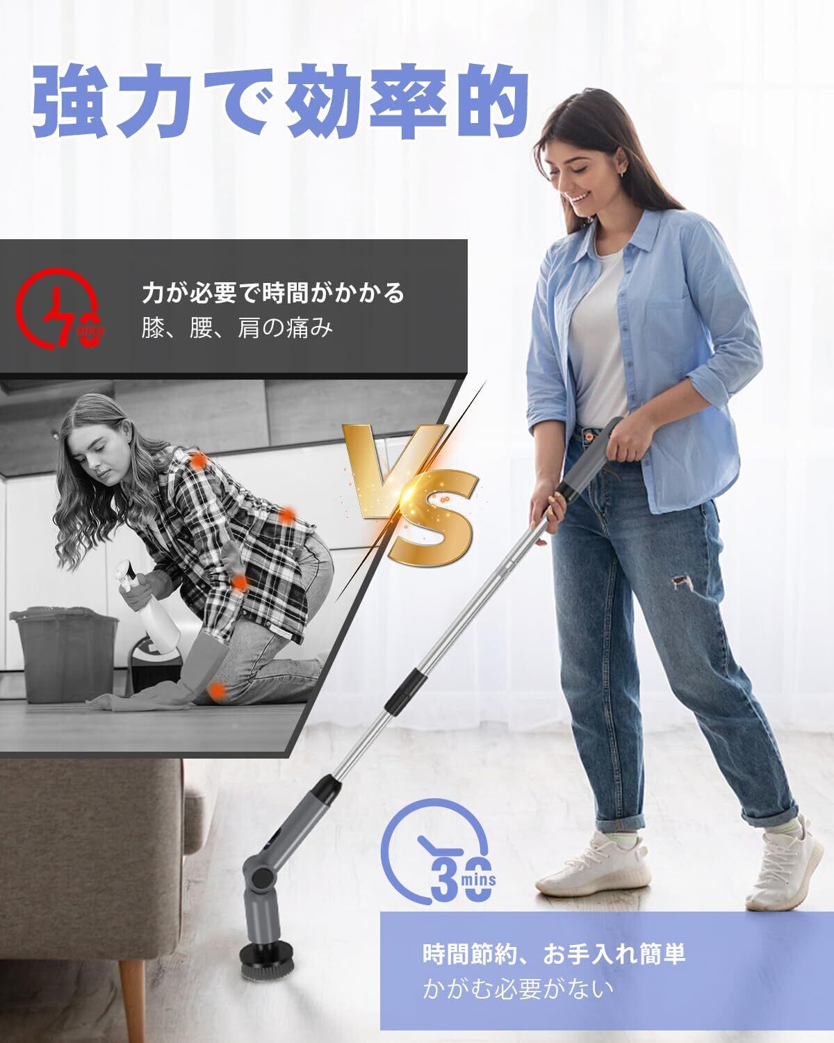 【2つの回転モード · 効率的で柔軟】風呂掃除ブラシは2つの速度設定があり、電源ボタンをオンにして、ボタンを短く押すだけでモードを切り替え、回転速度は450 RPMに達するため、力を入れずに洗剤を泡立てて(頑固な汚れを綺麗にする際は少しだけ押し込みながら使用して) 50kgまで耐えられる強力なモーターを搭載し、頑固な汚れを簡単に除去し、表面をピカピカにし、掃除の手間を省きま。電動デッキブラシは、忙しい主婦/夫の頼もしい味方で、長時間の使用でも疲れにくい。ご家族やご年配の方へのプレゼントにも最適です。