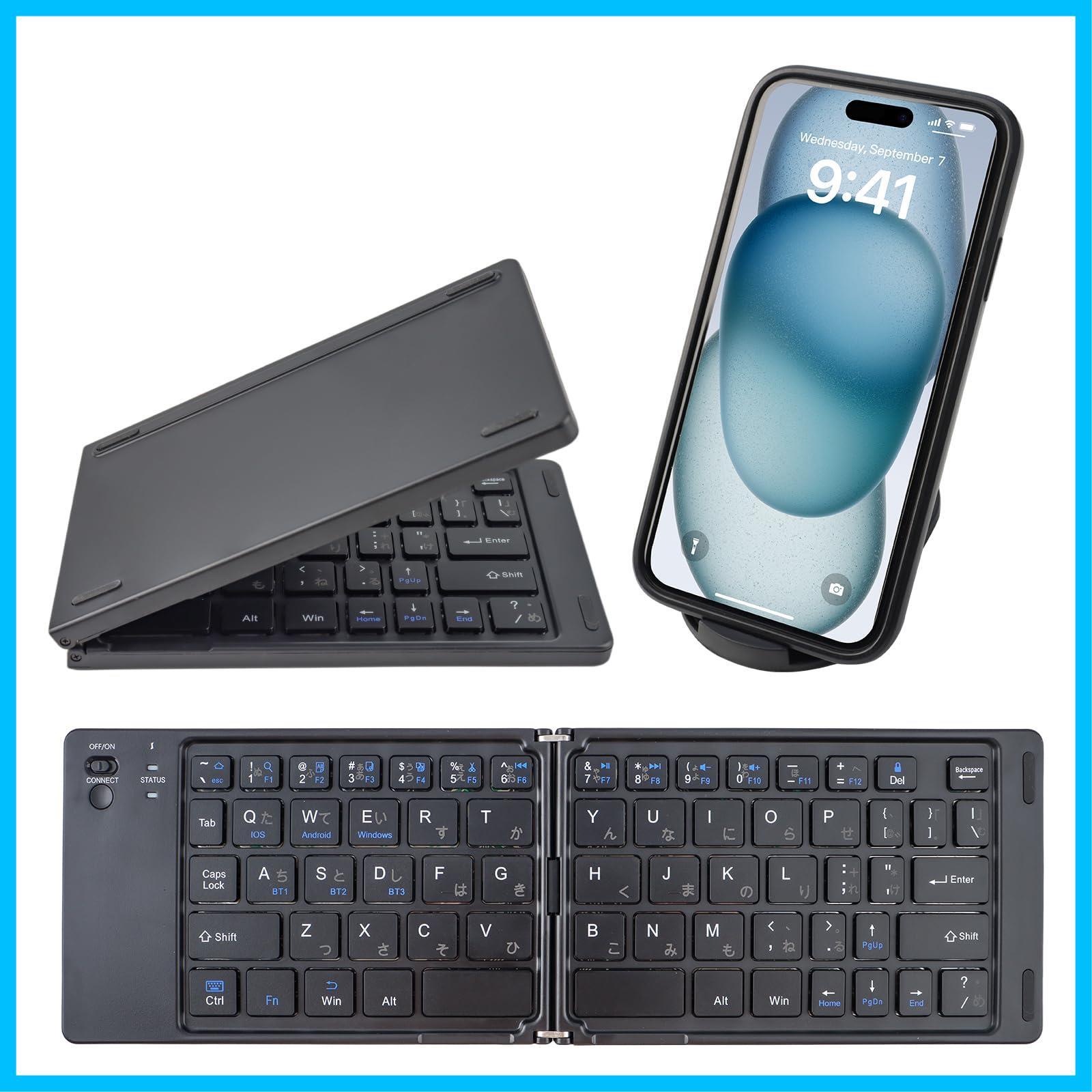 【3台同時接続/JIS配列】Bluetooth ワイヤレス 折り畳みキーボード 64キー タブレット用キーボード 薄型8mm 静音 平仮名刻印 Type-C充電 同時接続可能 IOS/Android/Windows/Mac兼用 パソコン ブラック
