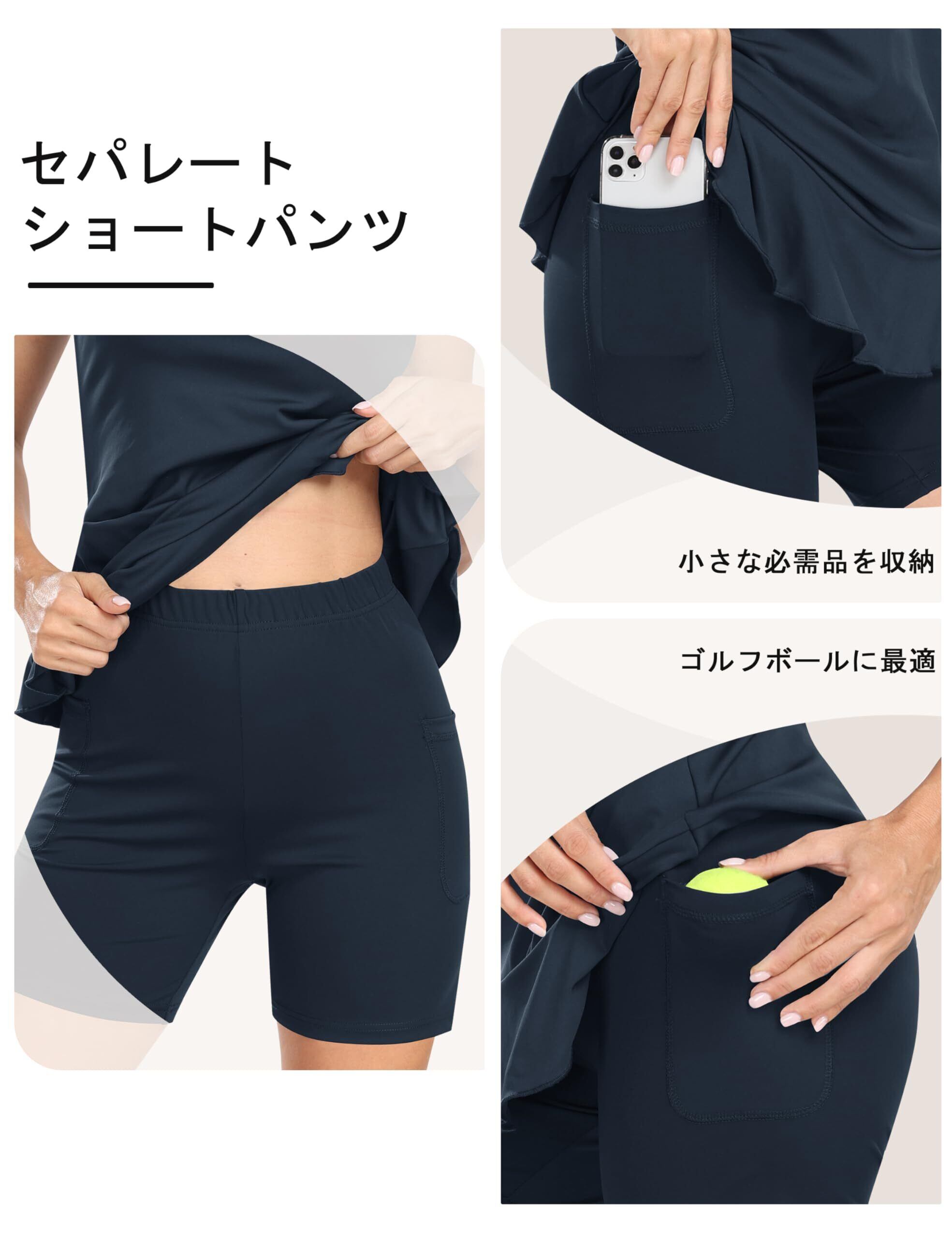 【機能性とおしゃれを両立!】 ポケット付きのデザインで、スマートフォンや小物を手軽に収納でき、便利です。インナーパンツもついているため、安心して動き回れるのも大きなポイント。ゴルフやテニスのプレイ中でも快適にお過ごしいただけます。