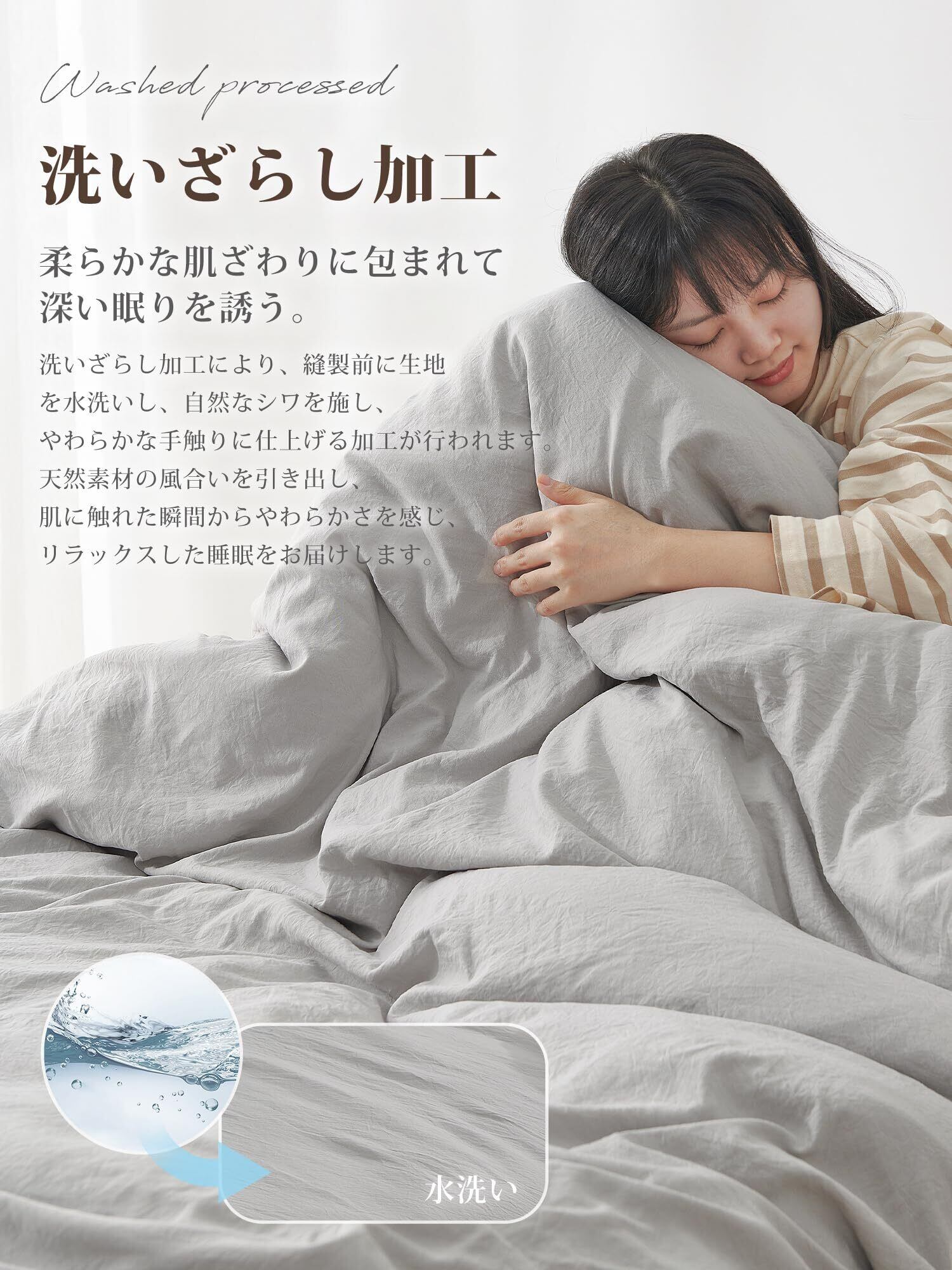 <洗いざらし&超柔らか肌触り>: 洗いざらしとは何度も洗って風合いが自然になったもの。お使いいただく初めから自然な風合いや、やわらかな肌触りを楽しめるように「洗い加工」を施しています。この加工を施した寝具は、洗濯や使用するごとにさらに柔らかくなり、肌馴染みも良くなります。