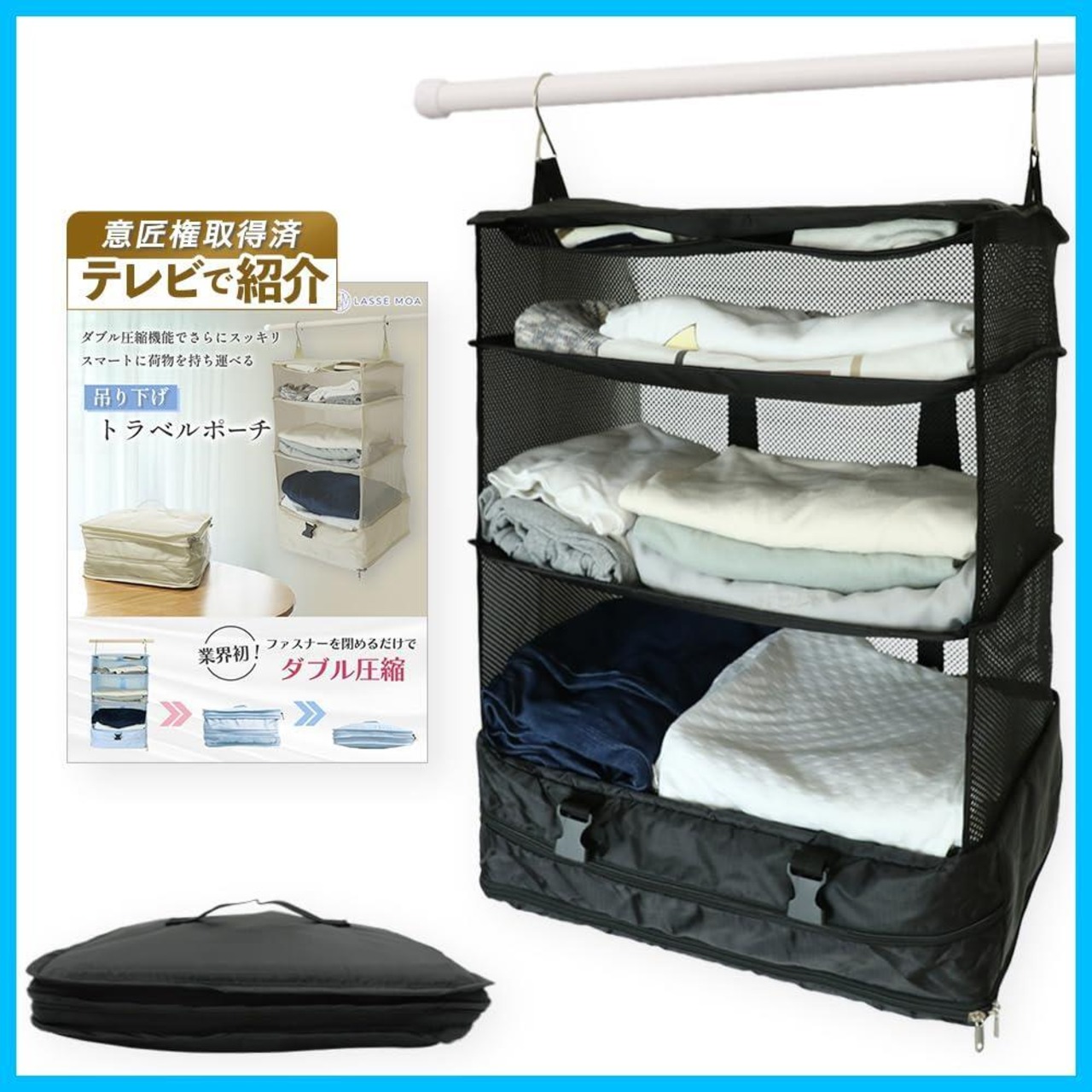 \「ひるおび」で紹介/ トラベルポーチ 吊り下げ 旅行用圧縮袋 【業界初”ダブル圧縮”でさらにコンパクト】 旅行 便利グッズ 衣類 収納 パッキング 意匠権取得済 LASSE MOA (ブラック, XLサイズ)