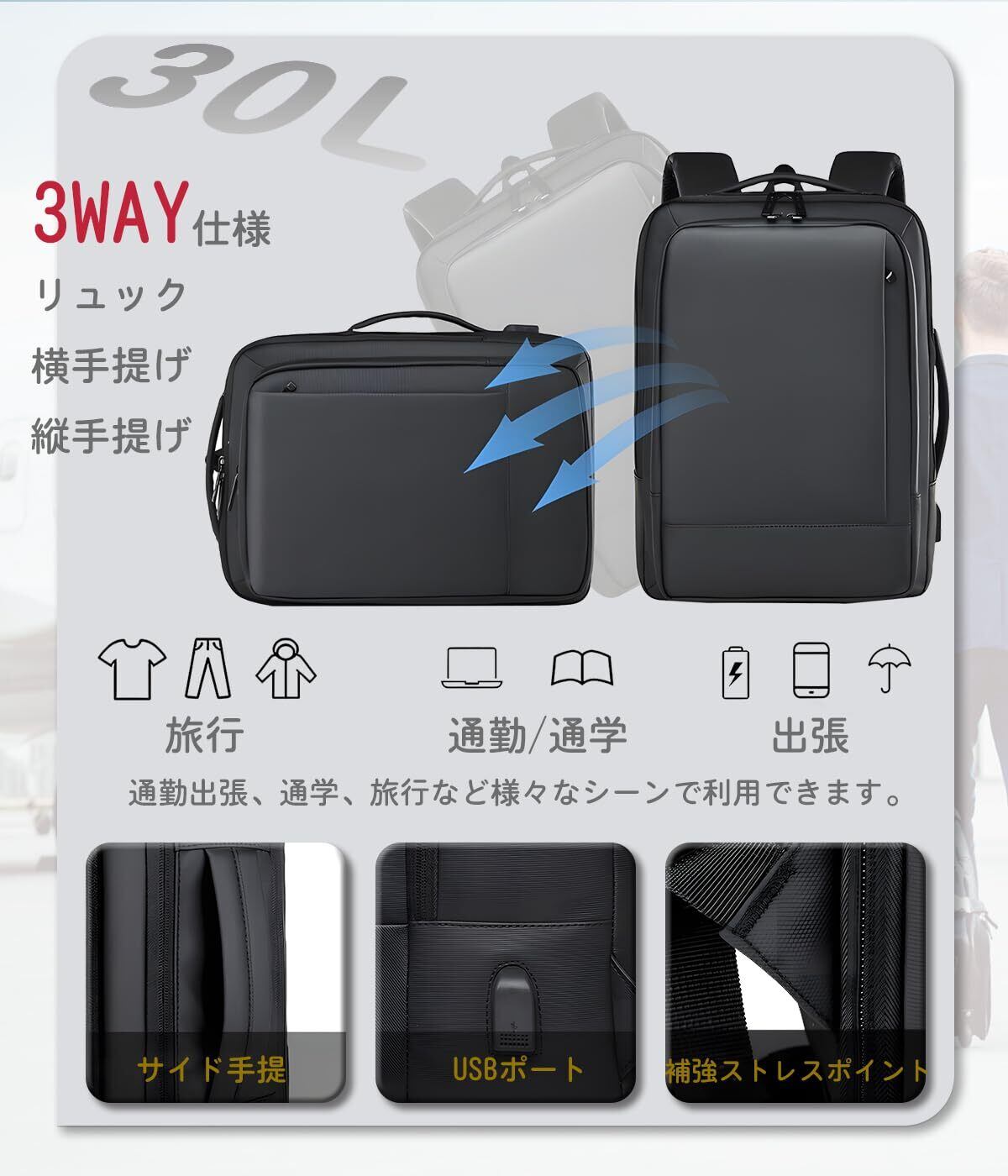 【30L大容量/拡張機能/機内持込】サイズ:45*34*12cm(拡張前:20L)/45*34*20cm(拡張後:30L);機内に持ち込み可能です。メイン収納部、PC収納ポケット及びフロントポケットも備える3wayリュックです。15.6インチpc、ノートパソコン、カメラ 、2~3日分の衣類、A4サイズの書類、教科書、傘、水筒、飲み物、お弁当、重い荷物、事務/出張/旅行/防災/登山用品などたっぷりと入る可能。荷物が少ない場合は、サイドのジッパーによりこのリュックをよりコンパクトにすることができます。