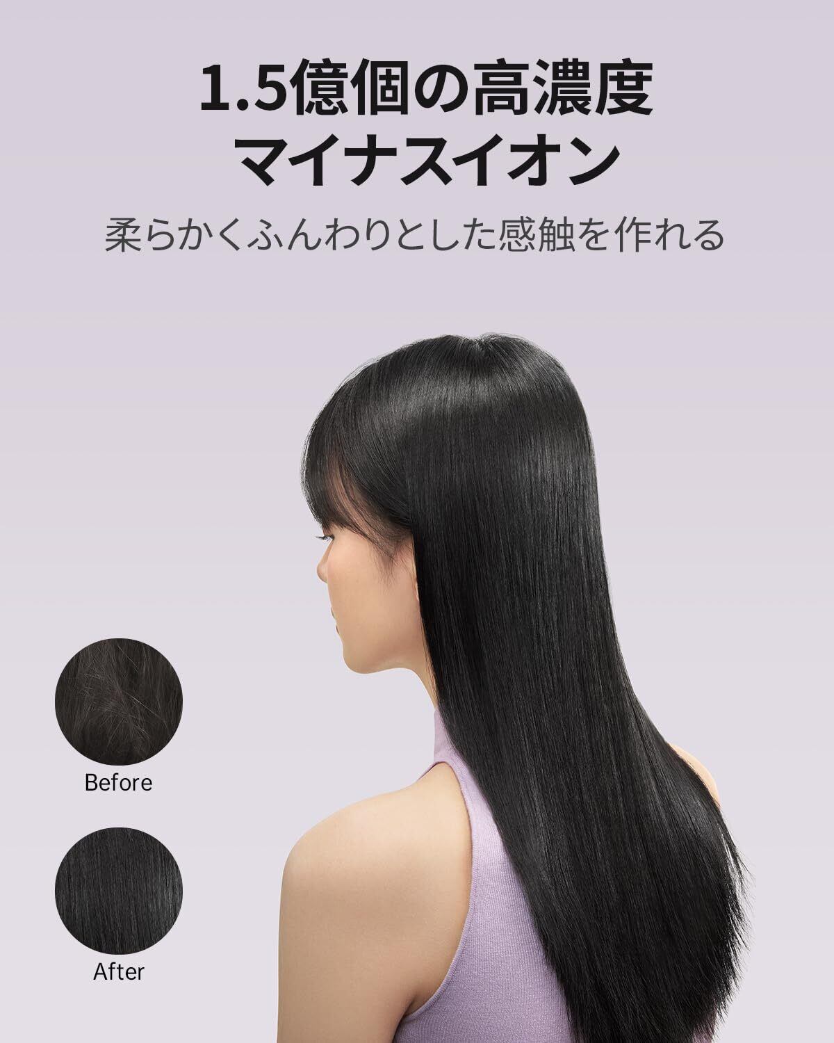 【1.5億個マイナスイオのヘアケア体験】SE Liteは1億5千万個の高濃度マイナスイオンを放出することで、静電気を中和し、縮れ毛をなめらかにし、あなたが求めていた柔らかくふんわりとした髪に仕上げます。より多くのマイナスイオンを髪に浸透させ、ツヤを与え、パサつきのない髪に仕上げます。