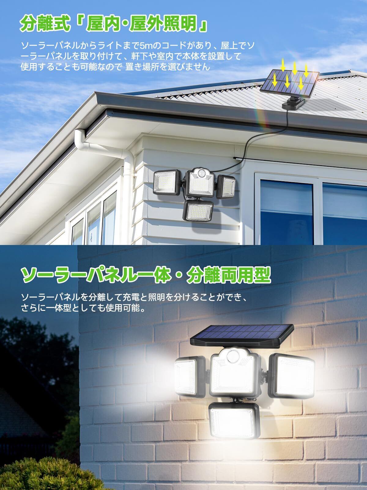 【改良型4灯分離式/一体式】改良設計のソーラーライトは、2種類のデザインから任意に選択できます。分離式ソーラーライト:ソーラーパネルはランプボディから分離され、付属の防水ケーブルでライトとパネルを5.5mまで離して取り付けることができます。ソーラーパネルは日当たりの良い場所に設置でき、ライトは屋内/屋外/駐車場など様々な場所に取り付けることができます。一体式ソーラーライト:ソーラーパネルがソーラーライトに吊り下げられ、ソーラーライト一体型になります。 どちらのスタイルのソーラーライトも単結晶ソーラーパネルを使用しており、従来のソーラーライトに比べて変換率が23%に向上しています。