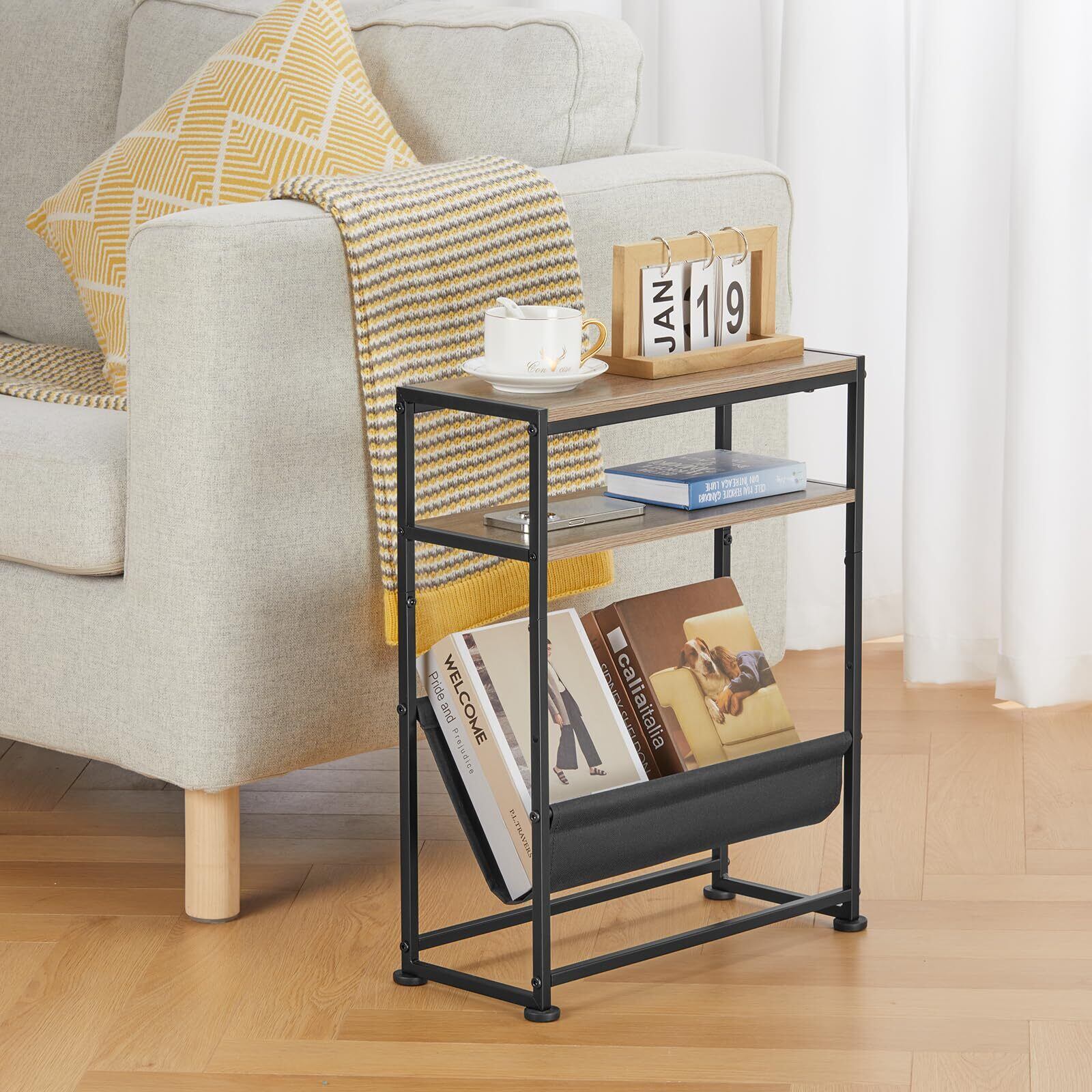【スリムで場所を取らないサイドテーブル】このマガジンラック付きのスリムサイドテーブルのサイズは43.2x18x55cm、製品重量:約2.7KGです。上層の天板は43.2*18cmであり、下層の物置板も空間あり、しかも丈夫な布袋付き、雑誌、ハンディブック、新聞などいくつかの大きい物を収納することができます。上下二階に分けて混んでいないので、空間を有効活用できます。