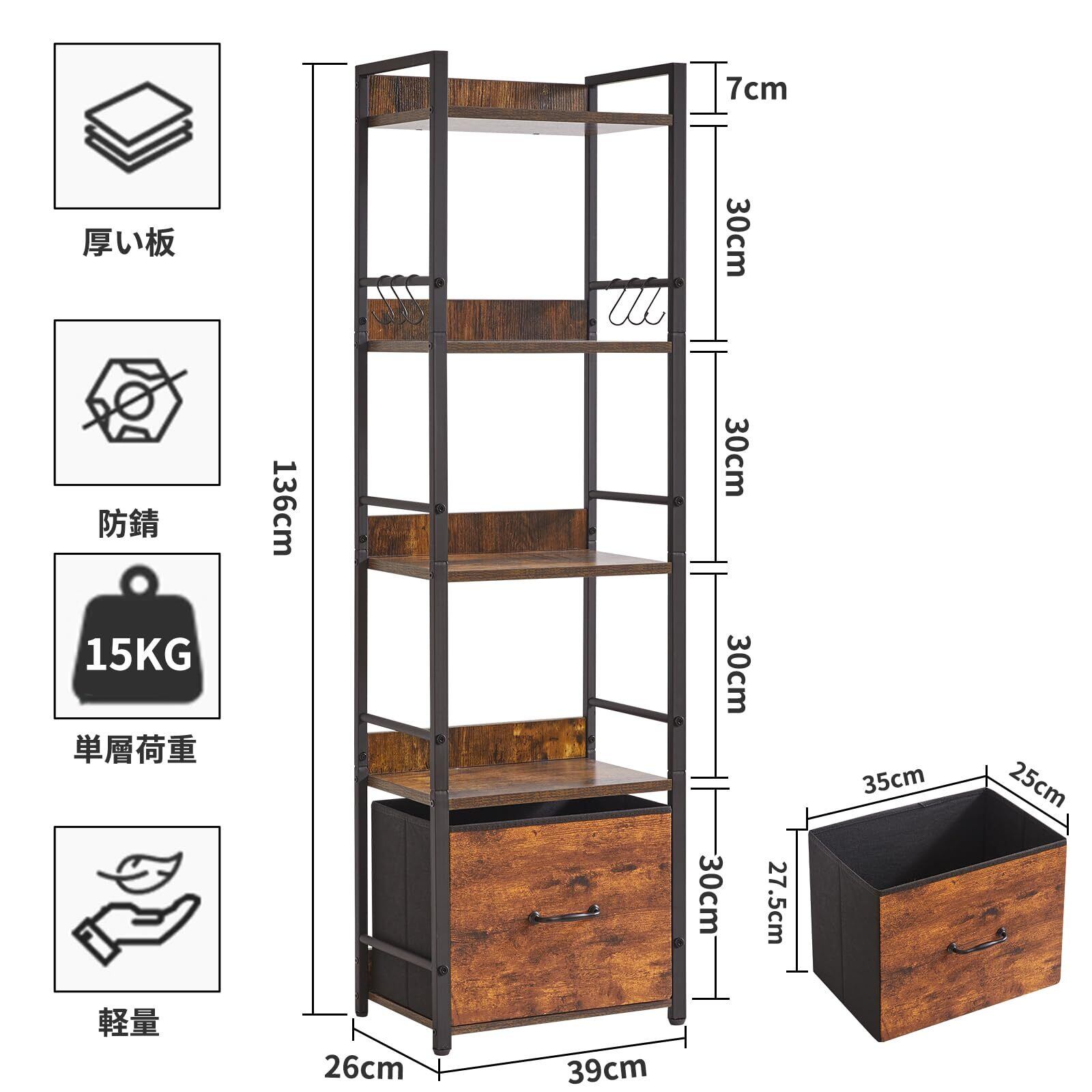 Aibiju 本棚 スリム リビング 棚 おしゃれ 幅39×奥行26×高さ136cm オープンシェルフ ラック 5段 収納ラック 収納棚 耐荷重75kg レトロ色の工業風 ヴィンテージ YD-BC001H