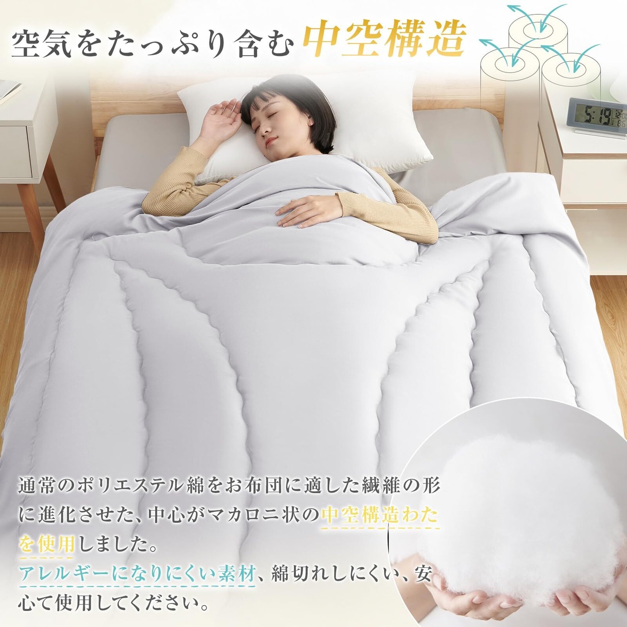 【暖かくて軽い! オールシーズン 掛け布団】薄くて軽いのに暖かい!暖かさをキープする同時に、圧迫感を与えることはありません。3D中空中綿を使用した掛け布団は羽毛の臭いが苦手、羽毛にアレルギーがある方におすすめ、重すぎず、軽すぎず、ちょうどいいボリュームでオールシーズン使えます。