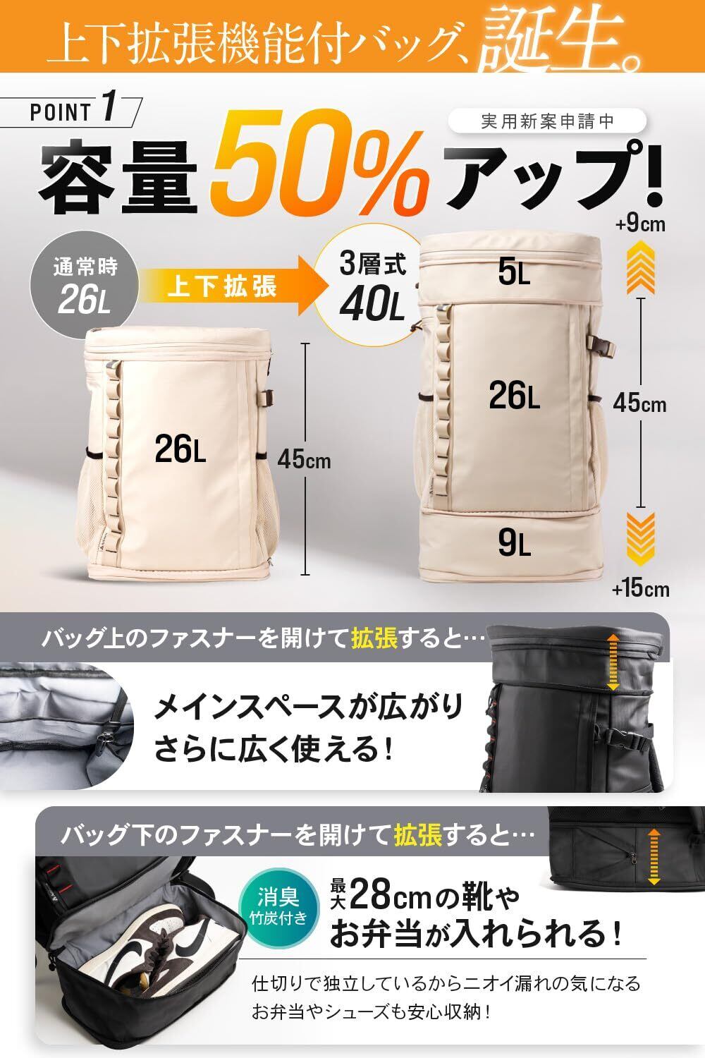【容量50%UP!世界初の上下拡張機能付】リュック 大容量 バッグ上部と下部のファスナーで拡張が可能![通常時 26ℓ]高さ45cm×幅34.5cm×奥行18cm⇒[拡張後 40ℓ] 高さ69cm×幅34.5cm×奥行18cm。