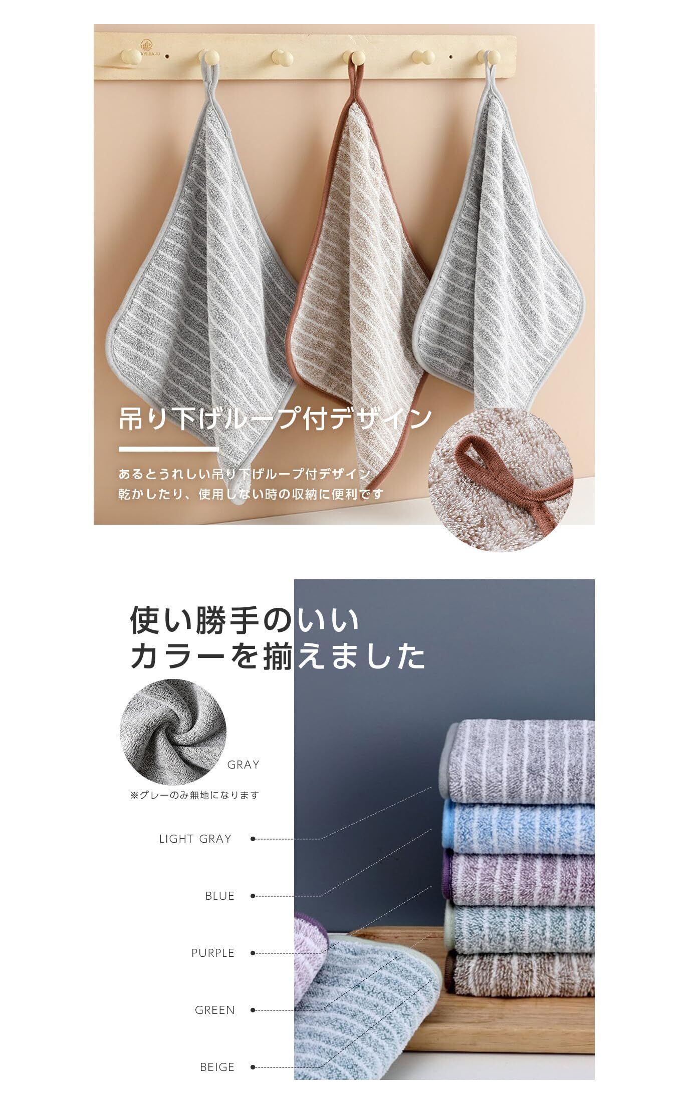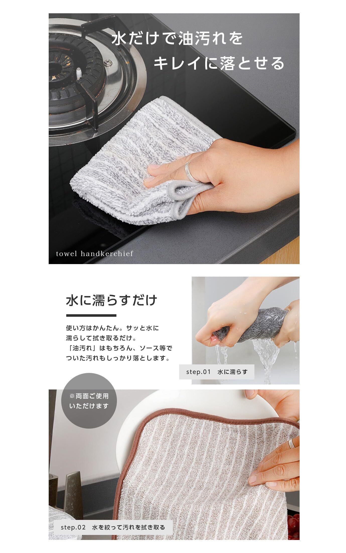 5枚のセットで、お得感たっぷり。使い回しができ、キッチンだけでなく、テーブルの拭き掃除や食器の水拭きなど、さまざまなシーンで活躍します。グレーの落ち着いた色合いは、おしゃれなキッチンにもぴったりです。
