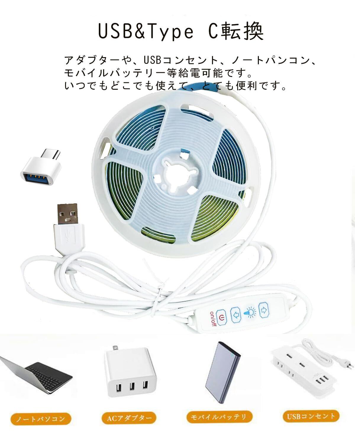 ledテープライト COB LEDストリップ USB 5v 320LEDs/m 調光スイッチ 10段階調光 カット可能 高輝度 両面テープ設置 幅8mm 3M 3000k 電球色 USB-TYPE C転換
