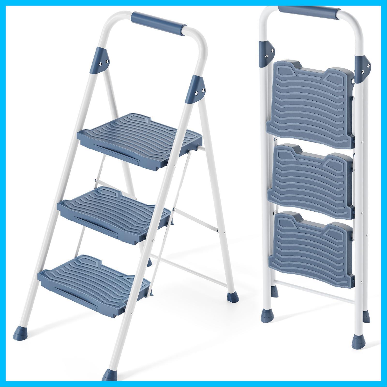【頑丈で多用途】:3段の青いはしごは高強度スチール製で、幅広の踏み板と太くなった固定バーの間に安定した三角形構造を形成し、バッククロスデザインは安全性と安定性を高め、リビングルーム、ベッドルーム、キッチン、パントリー、バスルーム、オフィス、ガレージなどでの使用に最適です。