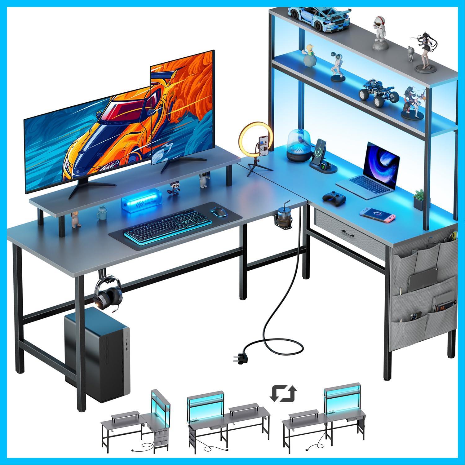 HLFURNITURE L字型ゲーミングデスク パソコンデスク LEDライト付きコンピューターテーブル 幅150cm コンセント付き 引き出し付き 収納ラック付き モニタースタンド 収納バッグ付きゲーミング作業机 学習机 コーナー桌子 リモートオフィス 組み立て簡単(灰色, 150x50cm) | Lulu