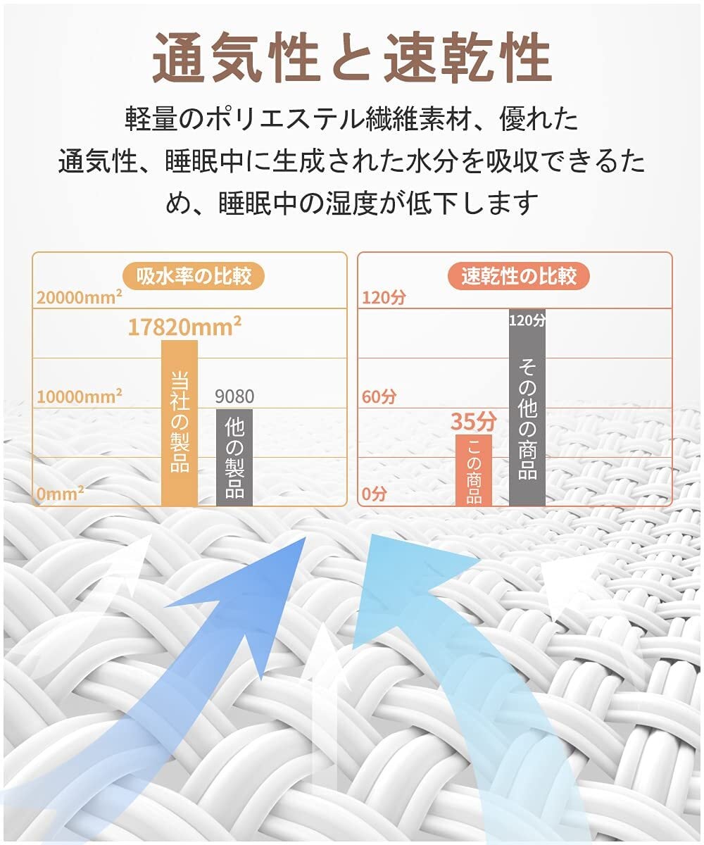 【通気性と速乾性】軽量のポリエステル繊維素材、優れた 通気性、睡眠中に生成された水分を吸収できるた め、睡眠中の湿度が低下します。洗った後は素早く乾かすことができます。