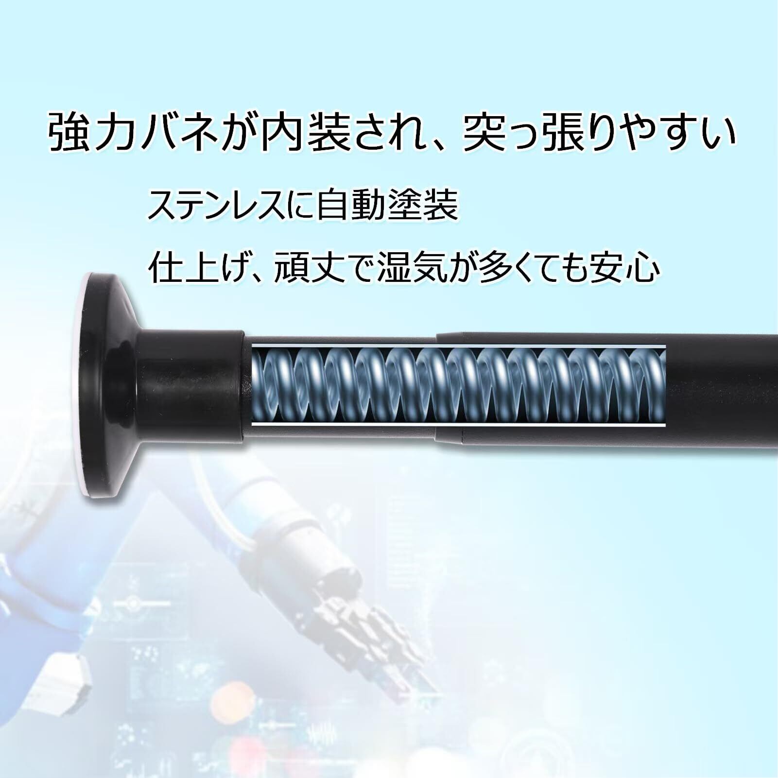 【強力ステンレス製】 つっぱり棒本体はサビにくい炭素鋼素材を採用し、樹脂の突っ張り棒よりガッチリしてて安定しています。更に塗装仕上げをしたことで、湿気の多い浴室でもカビの発生を抑制します。