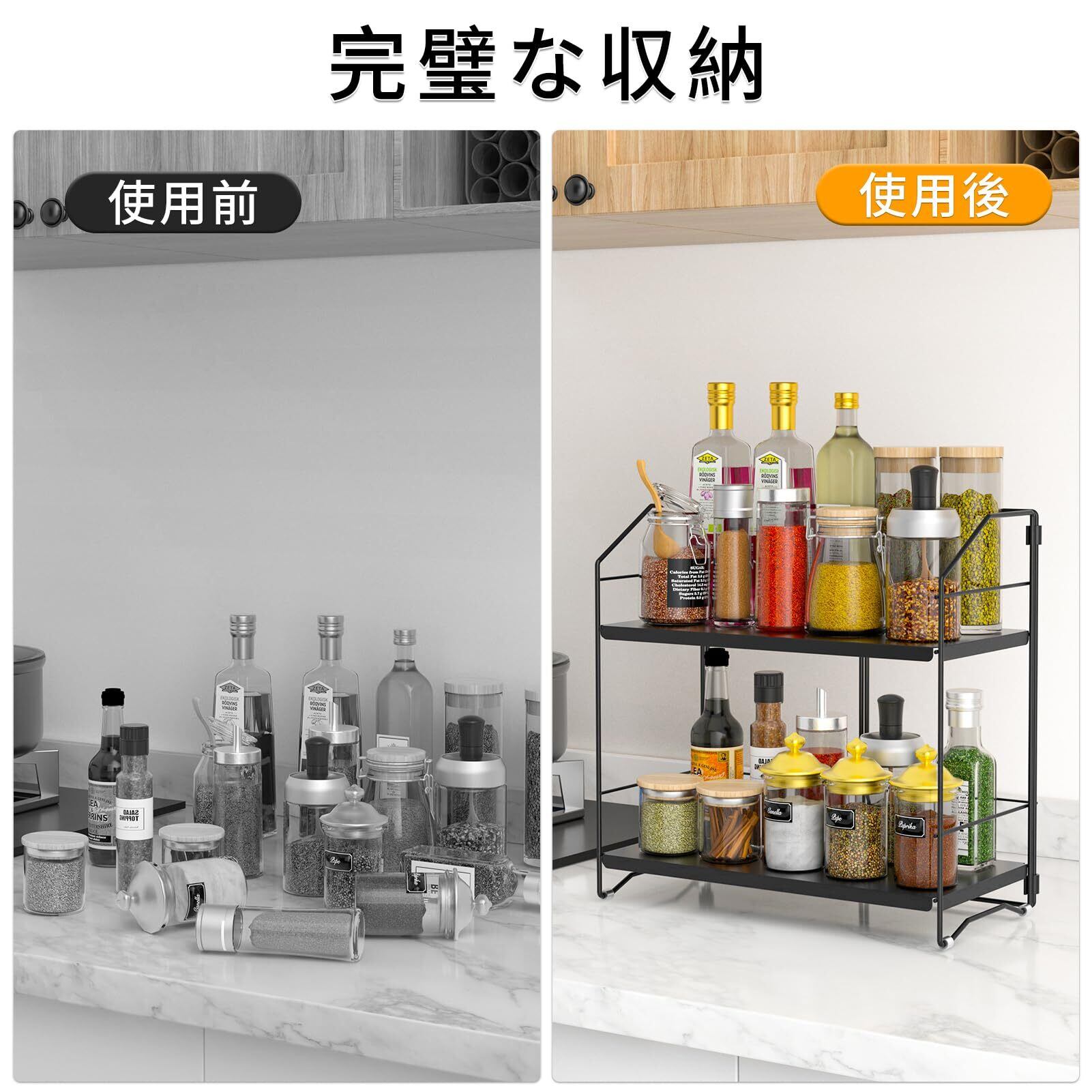 RCHYFEED 調味料ラック 2段式 スパイスラック 大容量 調味料収納ラック キッチンラック 高さ調整可能 台所収納 卓上収納 組み立てが簡単 調味料置き 省スペース 便利 おしゃれ (ブラック) | Lulu