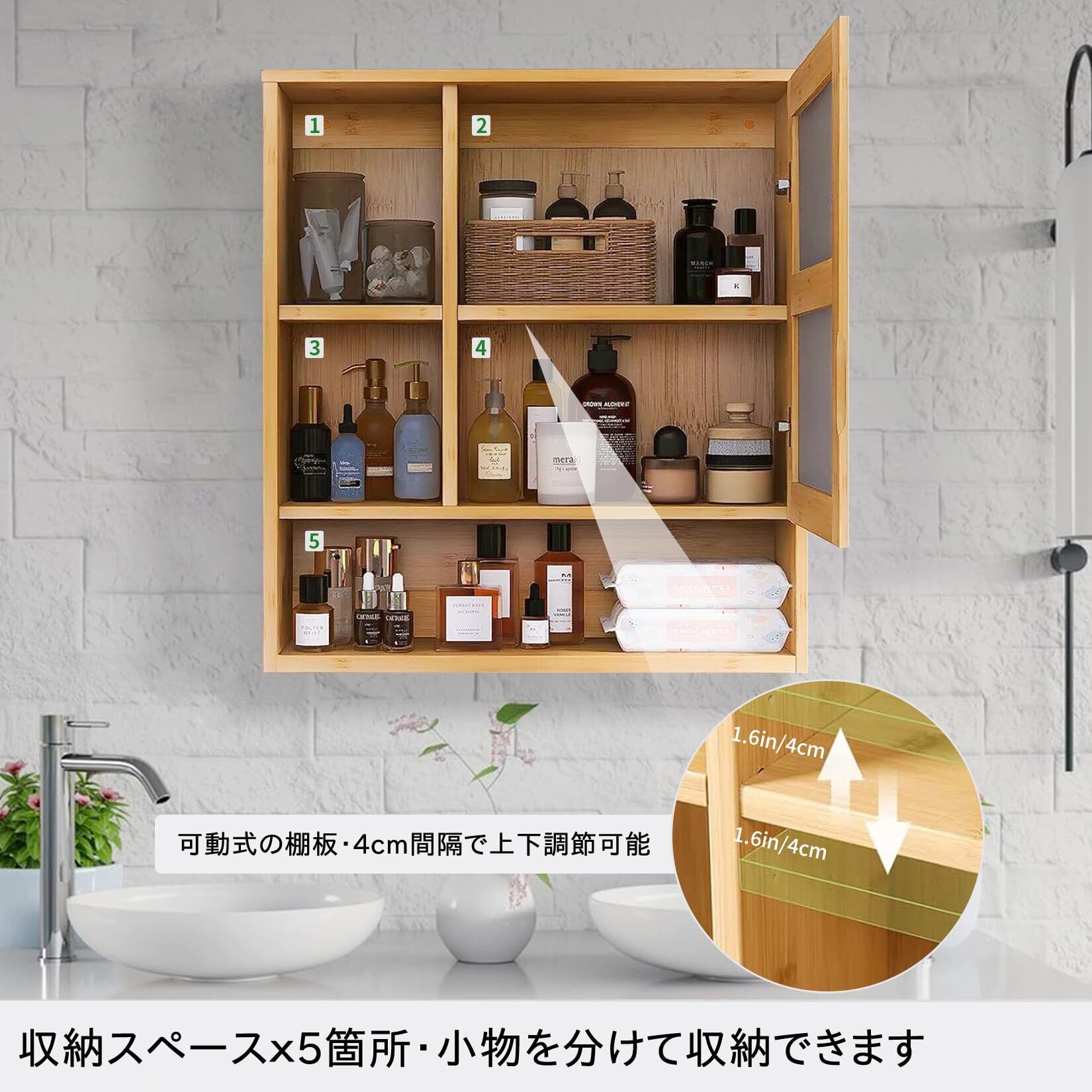【頑丈で安定性が高い】太い竹材で作られたキャビネットで、棚1段あたりは2.5kg/5kgまでの重さに耐えられ、重い洗剤や柔軟剤を置いても安定感があります。付属のネジとアンカーで固定するタイプなので、壁にしっかりと固定できます