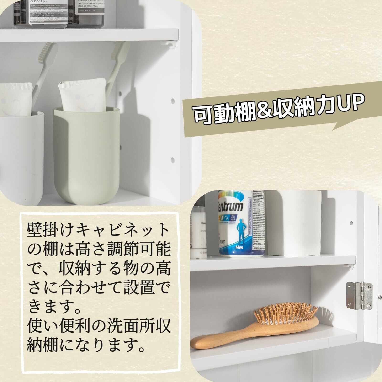 【可動棚&収納力UP】吊戸棚の棚は高さ調節可能で、収納する物の高さに合わせて設置できます。使い便利の洗面所収納棚になります。