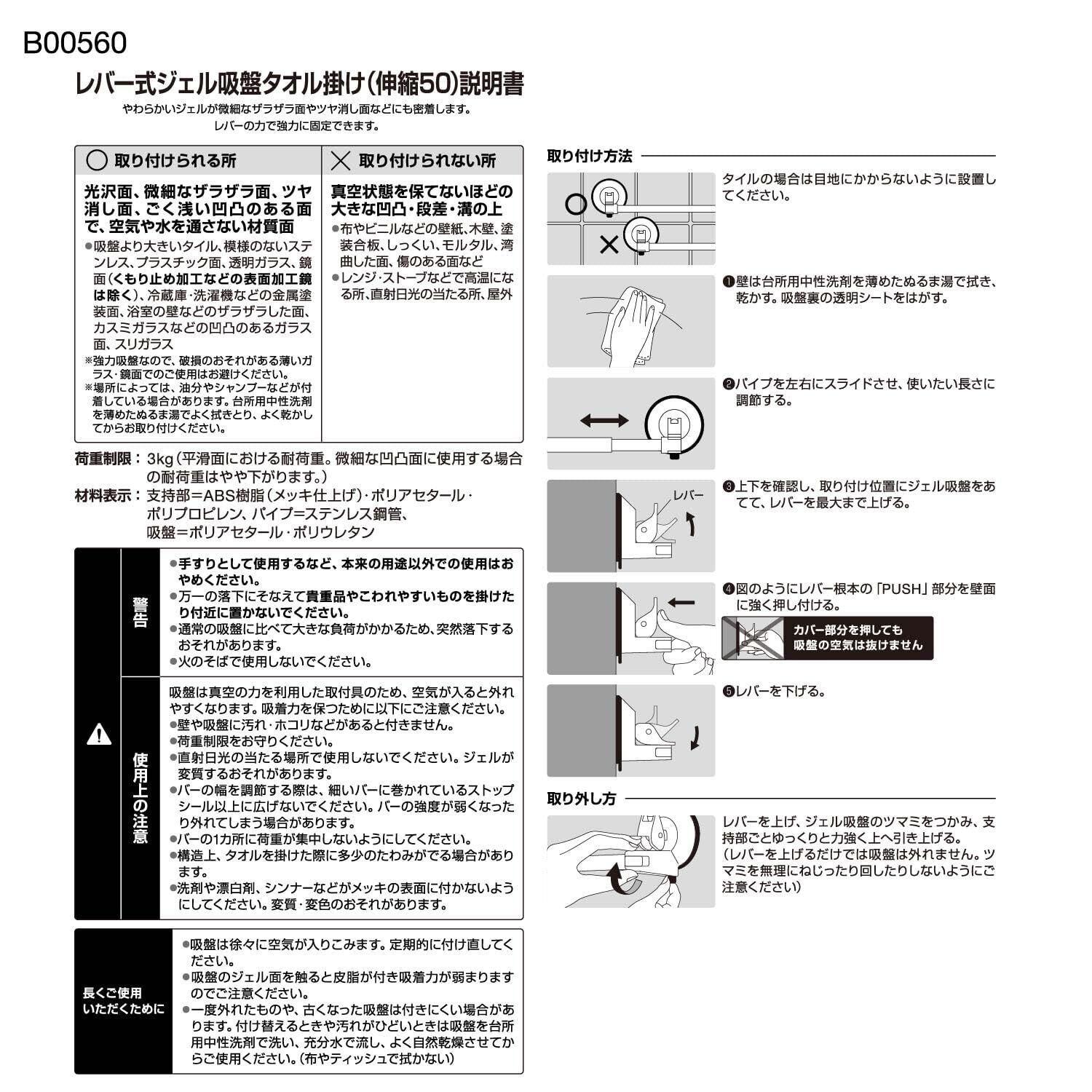 レバー式 ジェル吸盤 伸縮 タオル掛け ステンレス 伸縮幅 34.5~55cm(干幅26.5~47cm) 耐荷重3kg フェイスタオルサイズ