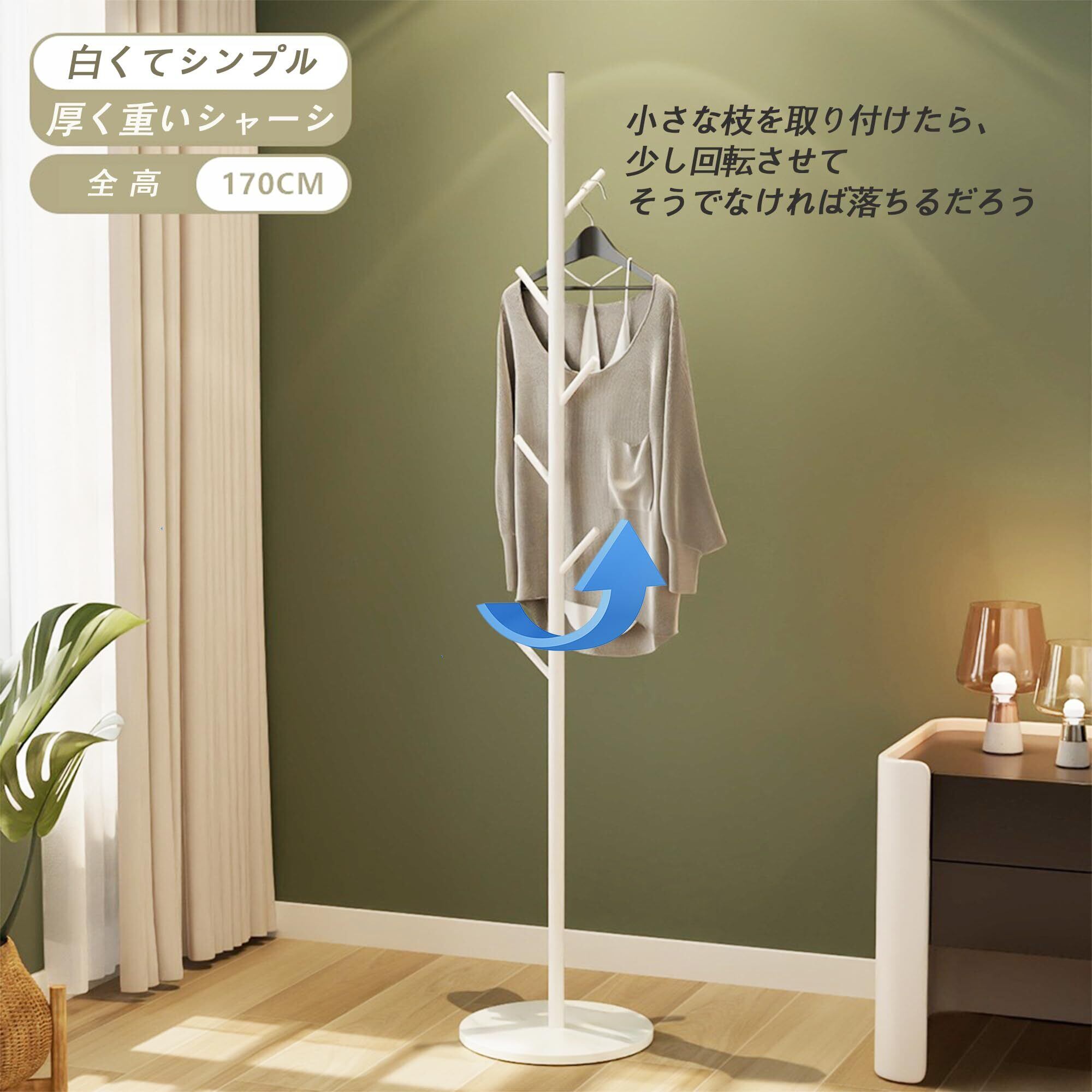 170cmの大きなベースを採用しており、安定感を高めています。金属製の耐久性のある構造で、重いコートやバッグを掛けても倒れる心配がほとんどありません。この安心感にも大満足!