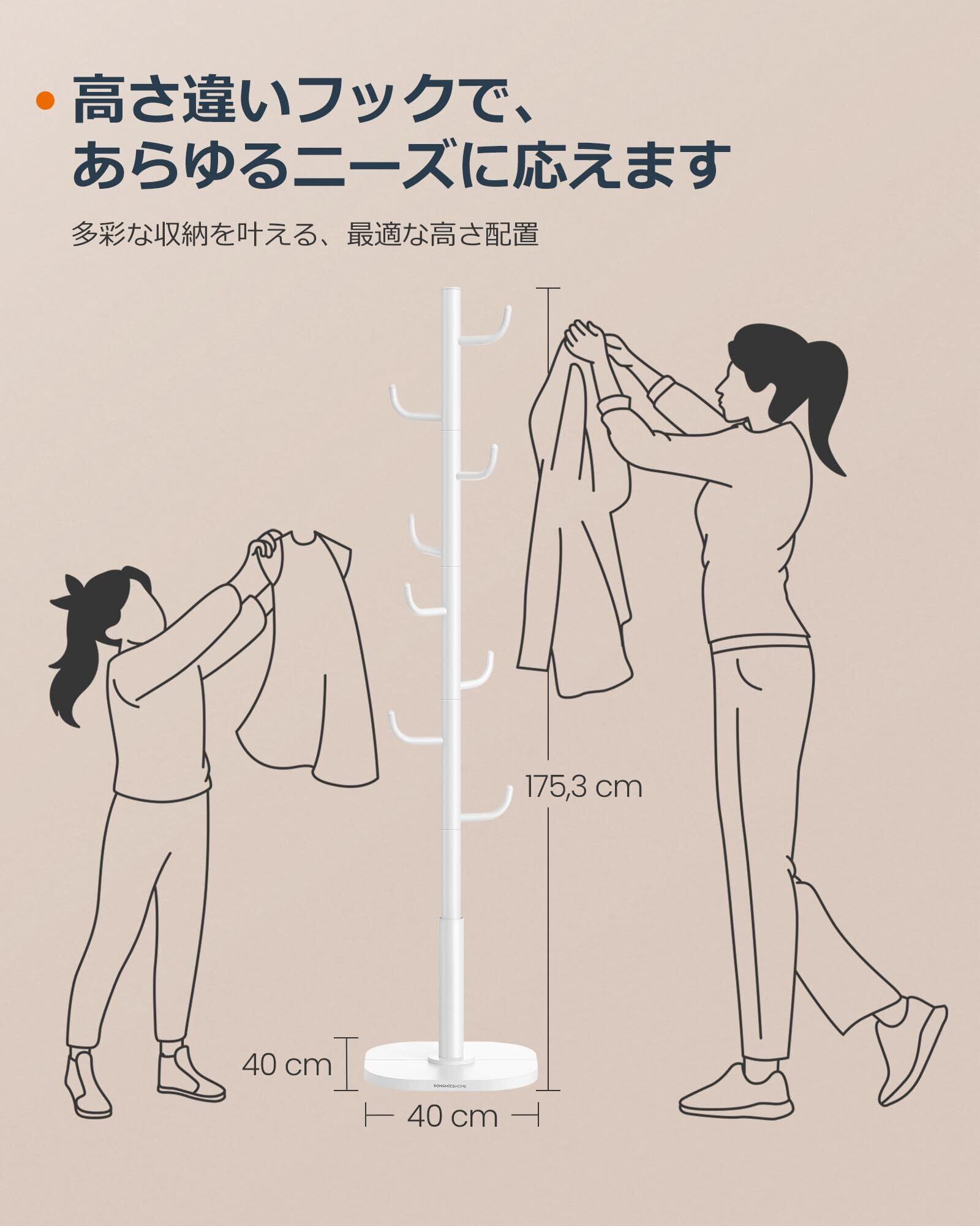 SONGMICS HOMEのコートラックなら、玄関周りが散らかる心配もありません!40cm(幅)×40cm(奥行き)×175cm(高さ)のスタンドタイプで、機能性とスタイリッシュなデザインが両立。どんなお部屋にもマッチします